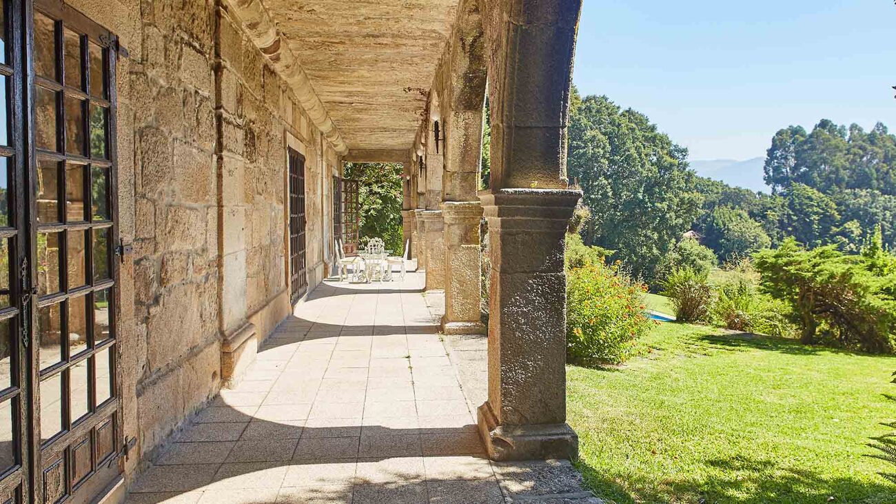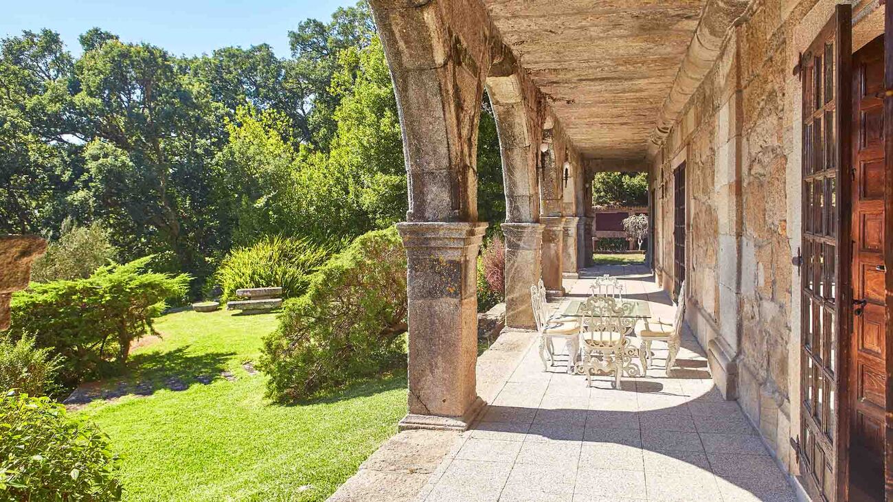 Esta propiedad es una pieza verdaderamente singular, donde arquitectura y paisaje alcanzan una armonía excepcional. Su origen en el siglo XVIII y su condición de Monumento Histórico y Bien de Interés Cultural subrayan un valor patrimonial único dentro del Val Miñor. La fachada sur, con once arcos en la planta superior y cinco en la inferior, se erige como su sello más distintivo: una composición de una pureza arquitectónica poco habitual en los pazos gallegos, bañada siempre por la luz del sur. La finca, de más de diez hectáreas, está poblada por robles, nogales y alcornoques centenarios que conforman un paisaje privado y sereno. La ubicación en ladera y la orientación privilegiada refuerzan la luminosidad y el microclima, creando una sensación de bienestar constante. El conjunto se completa con elementos tradicionales como el hórreo y la solana, además de una piscina perfectamente integrada en el entorno. Una propiedad irrepetible, donde historia y naturaleza se unen con una elegancia que trasciende el tiempo.