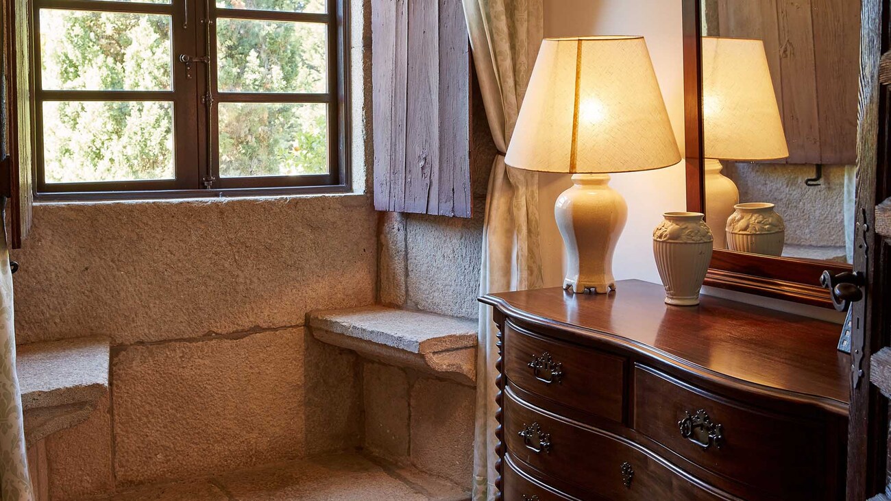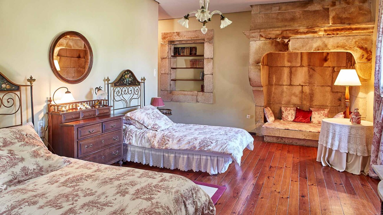 El acceso a la primera planta se realiza desde el exterior a través de una imponente escalera de granito situada en el patio central. En este nivel superior se dispone un segundo salón y siete dormitorios con vistas abiertas al Val Miñor, tres de ellos especialmente espaciosos y dotados de grandes ventanales que bañan las estancias de luz natural.