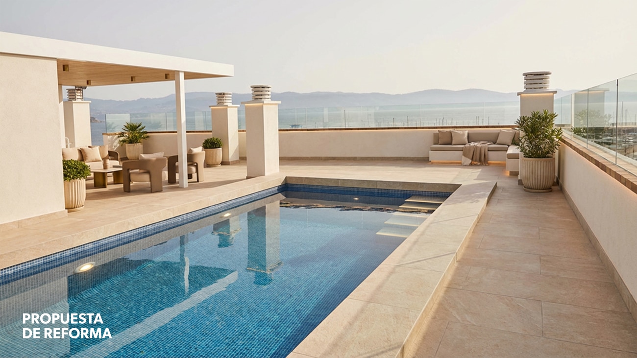 Distribuida entre las plantas sexta y séptima del edificio, es ático de 301 m2 ofrece una escala poco habitual en un enclave de estas características. A ello se suma una extraordinaria terraza privada en cubierta de 232 m2 con piscina, concebida como una prolongación natural de la vivienda y como un auténtico mirador sobre el mar.