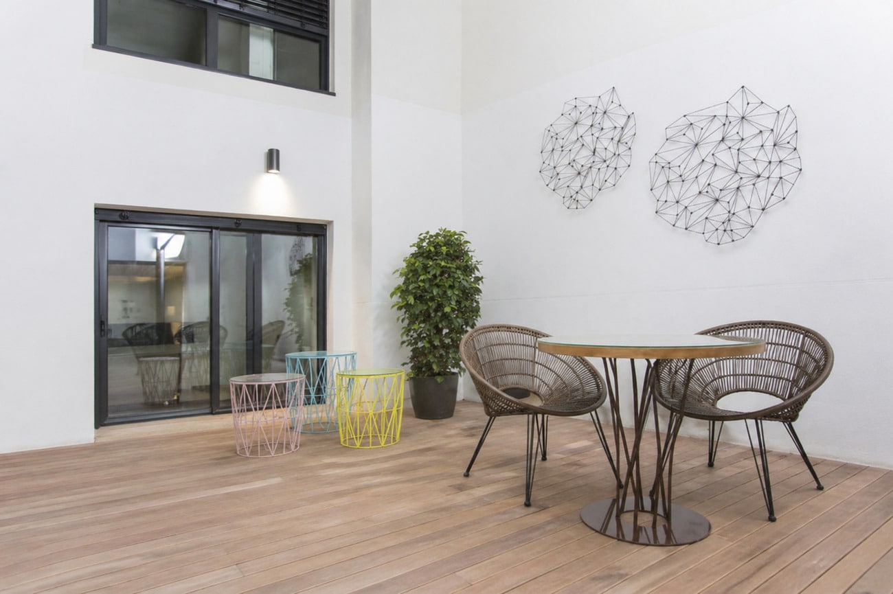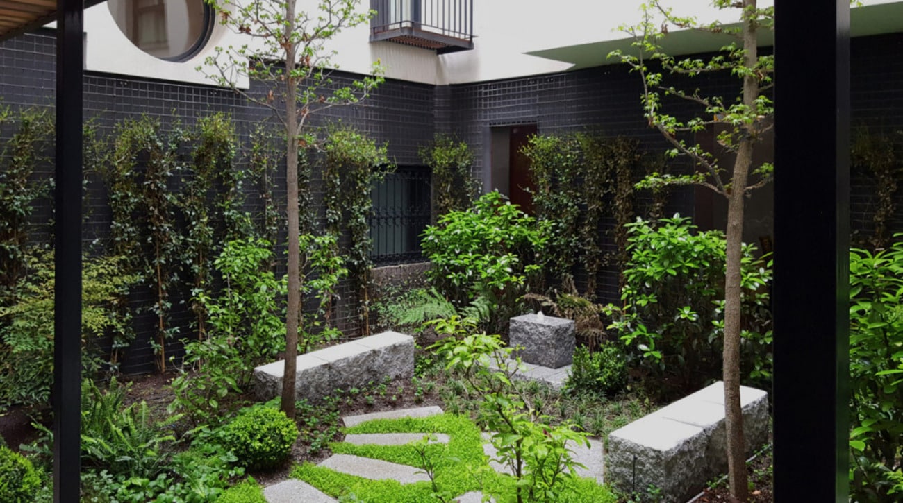 Tras su fachada atemporal, el edificio revela una secuencia de espacios comunes concebidos como una extensión natural de la vivienda. El patio central, cubierto por un lucernario, filtra la luz a través de la vegetación y una cuidada iluminación LED, generando una atmósfera serena y envolvente. A ello se suman zonas ajardinadas que introducen pausas de calma en el ritmo urbano y servicios diseñados para una vida sin concesiones: gimnasio privado, trasteros y un ascensor que articula todas las plantas con discreción.