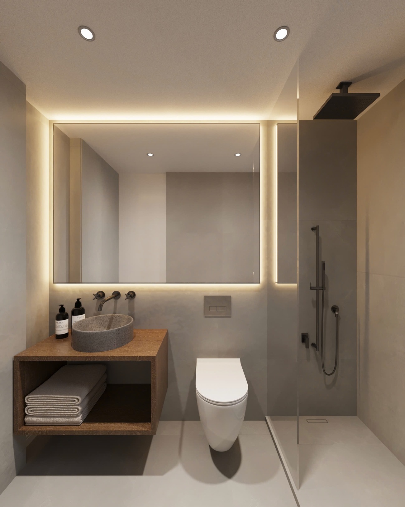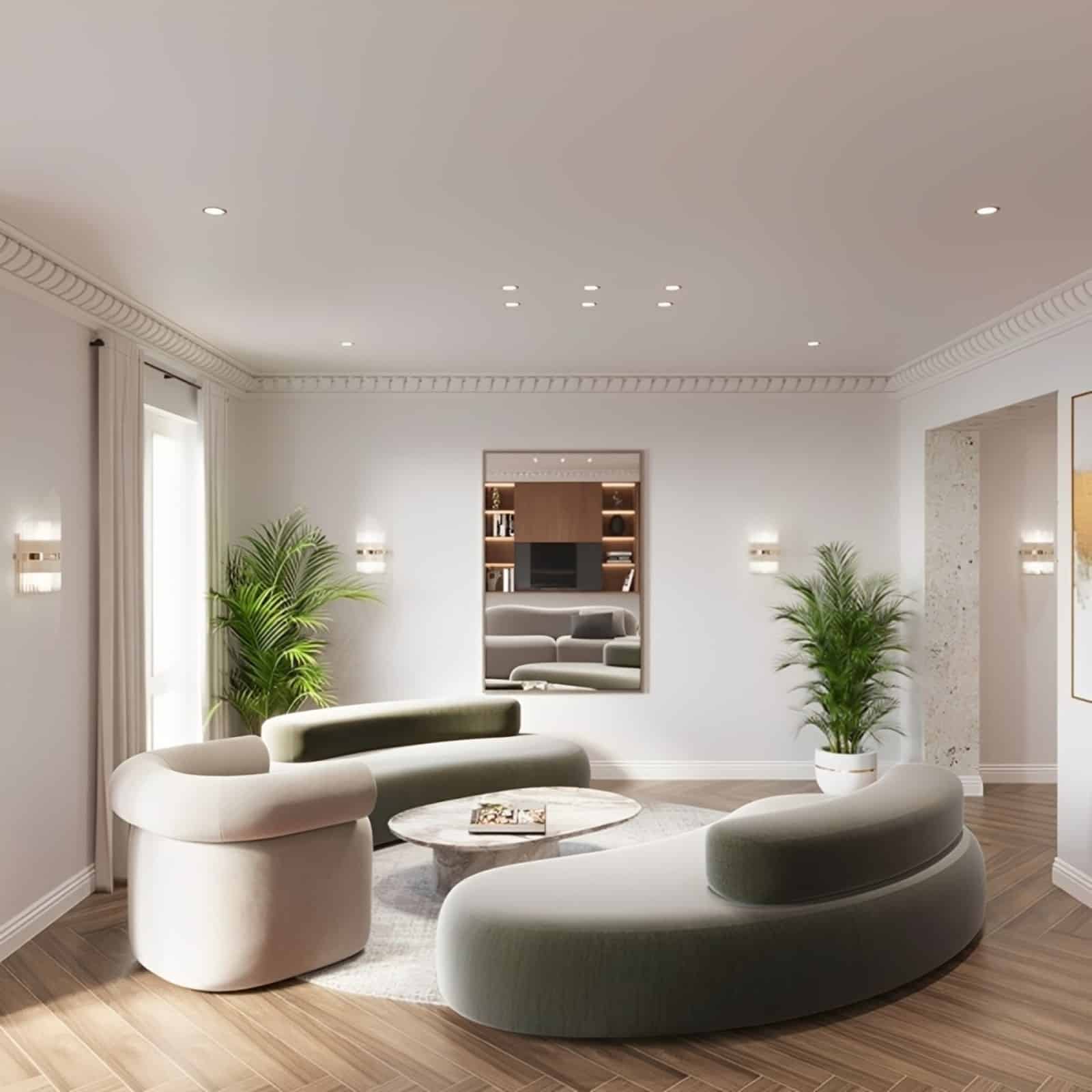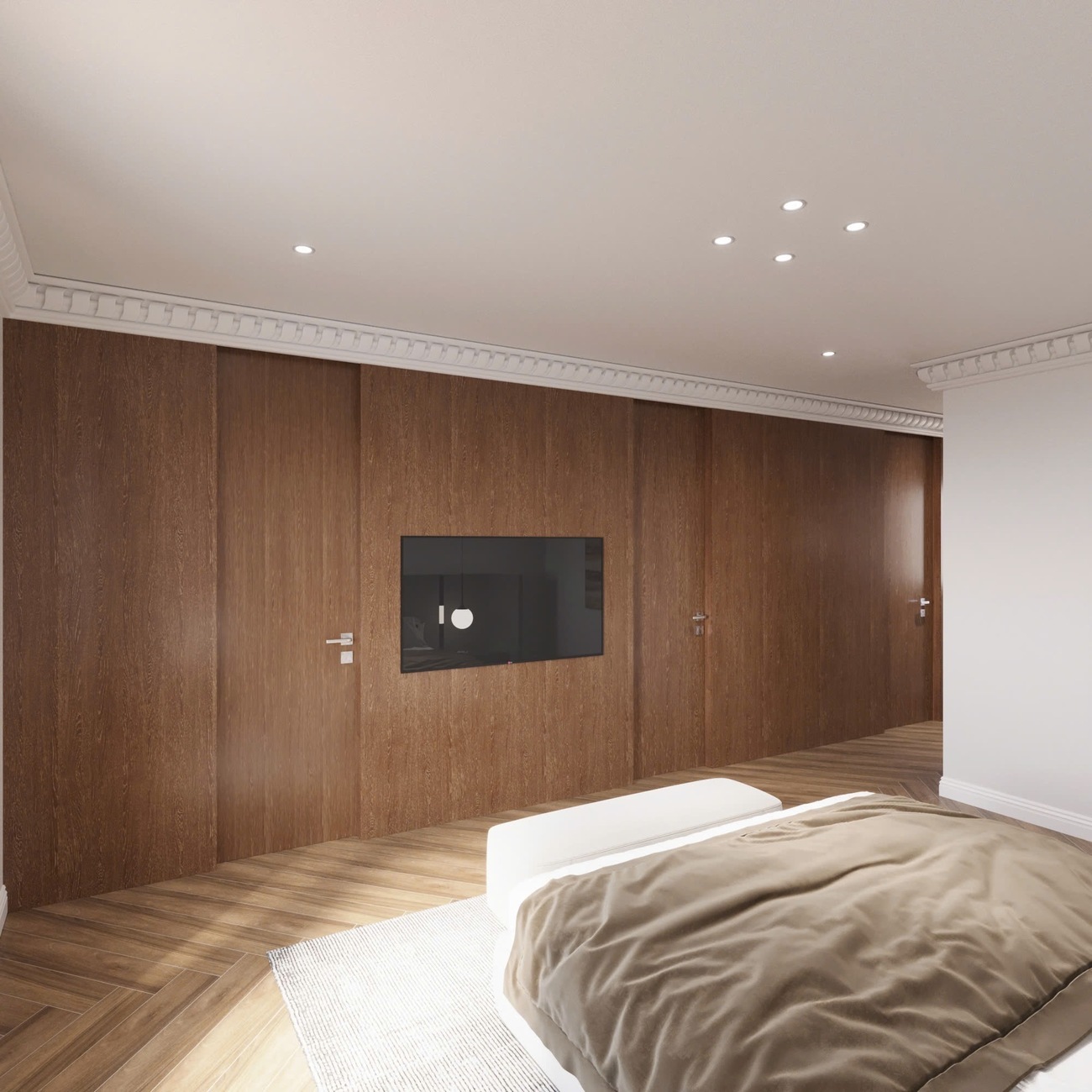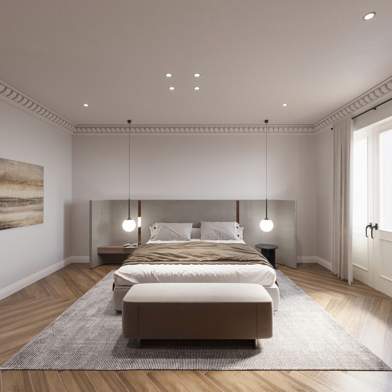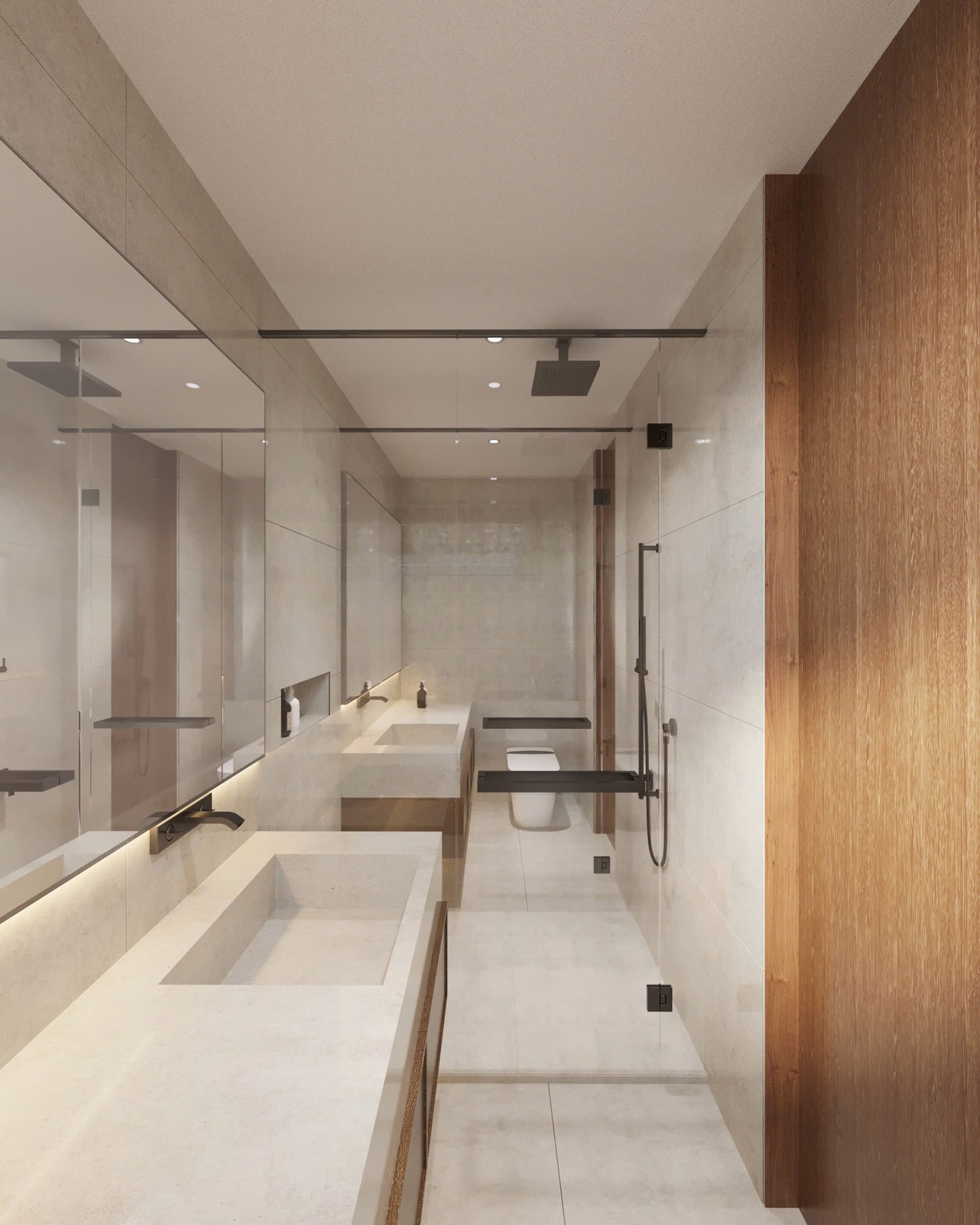 La zona privada está formada por tres dormitorios; el dormitorio principal se plantea como una suite privada con baño doble de diseño y un vestidor independiente, mientras que los otros dos dormitorios contarán con su propio baño, garantizando privacidad y comodidad.