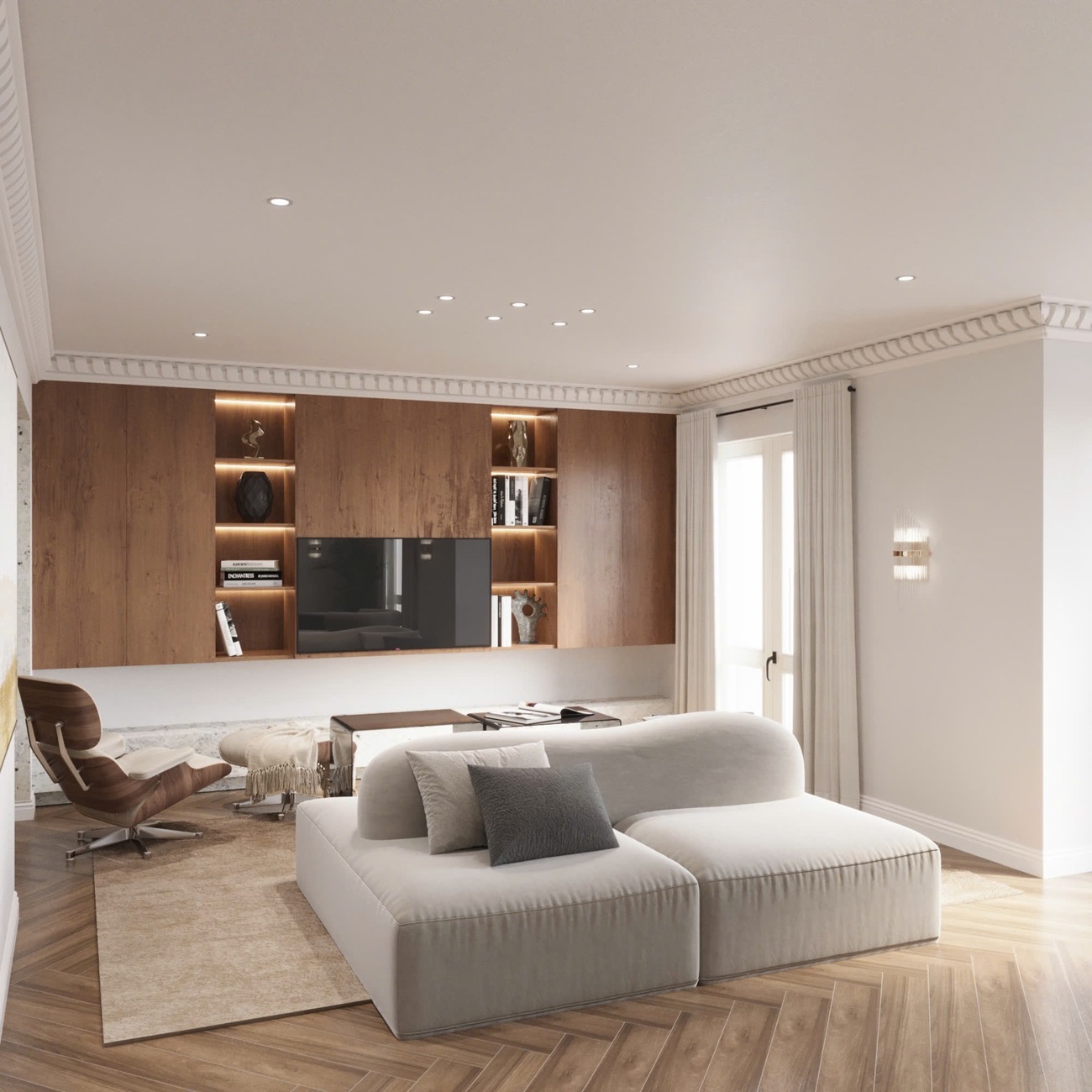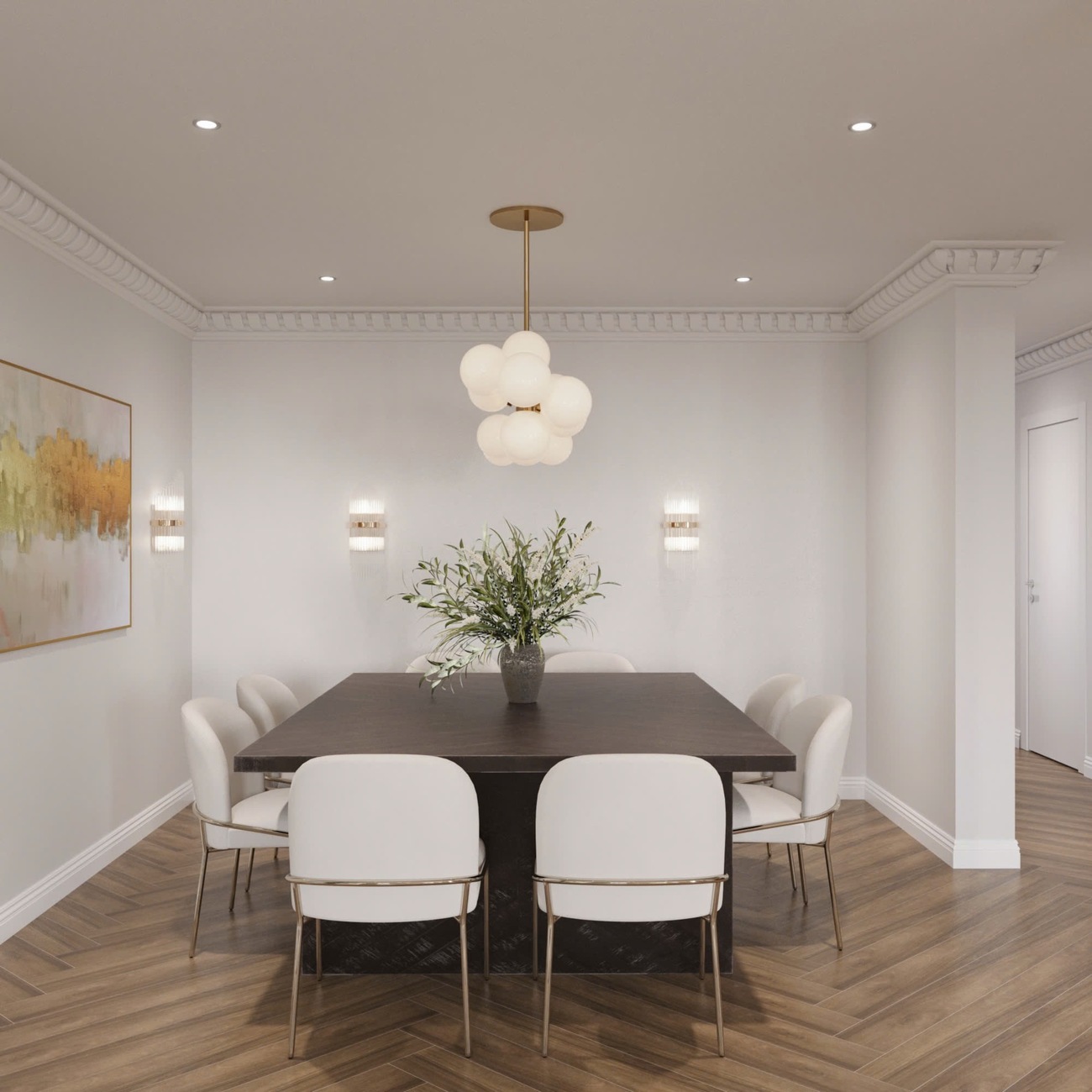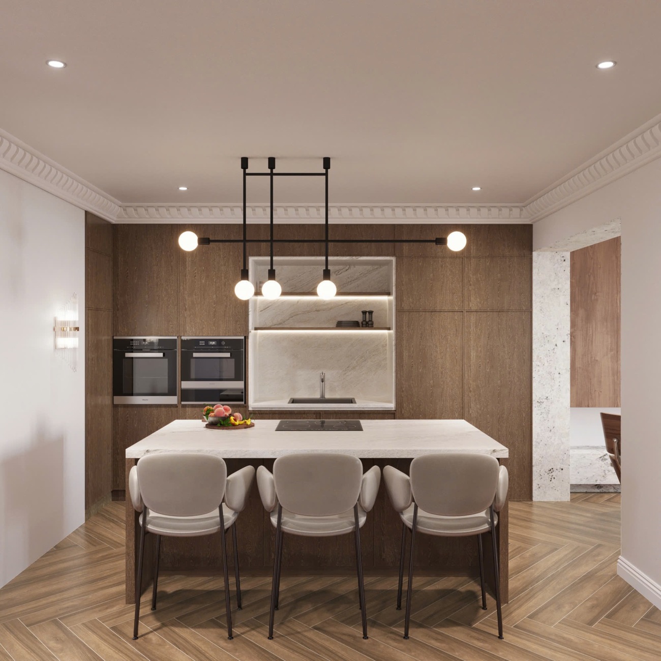El proyecto diseñado por la propiedad propone una redistribución contemporánea que combina funcionalidad, confort y elegancia. Contempla un amplio salón con dos ambientes, ideal para compartir momentos en familia o con amigos. La cocina-comedor con isla central se concibe como el corazón de la vivienda.
