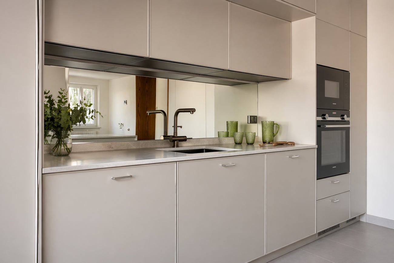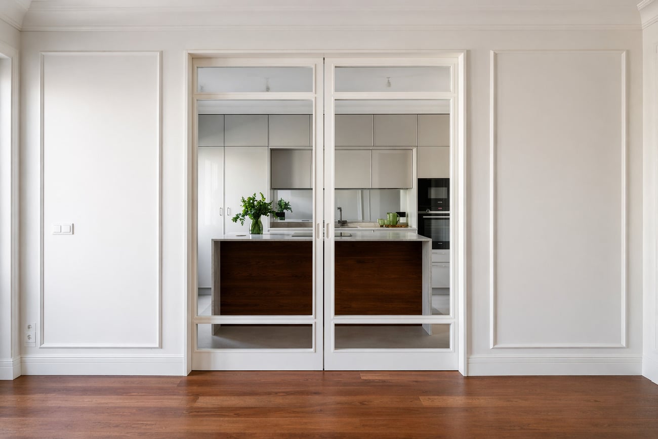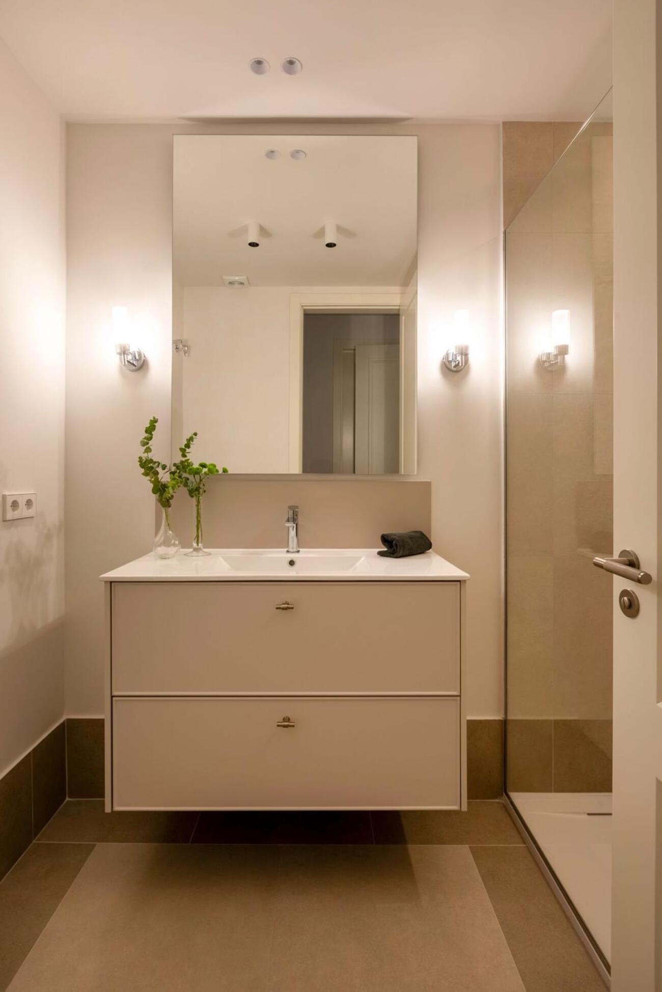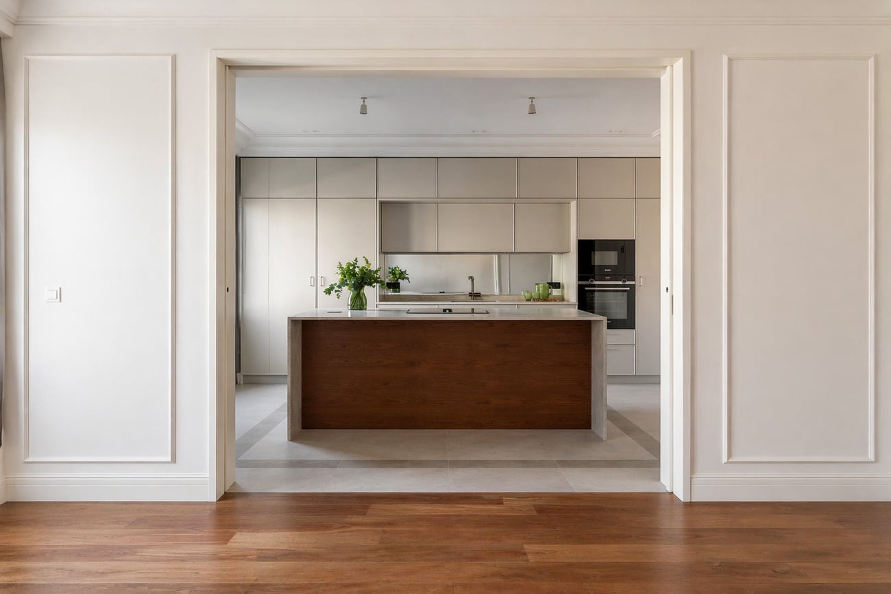 La vivienda articula sus espacios en torno a una zona de día amplia y fluida, donde el salón y la cocina conviven en un mismo ambiente, con la posibilidad de independizarse mediante una elegante puerta corredera.