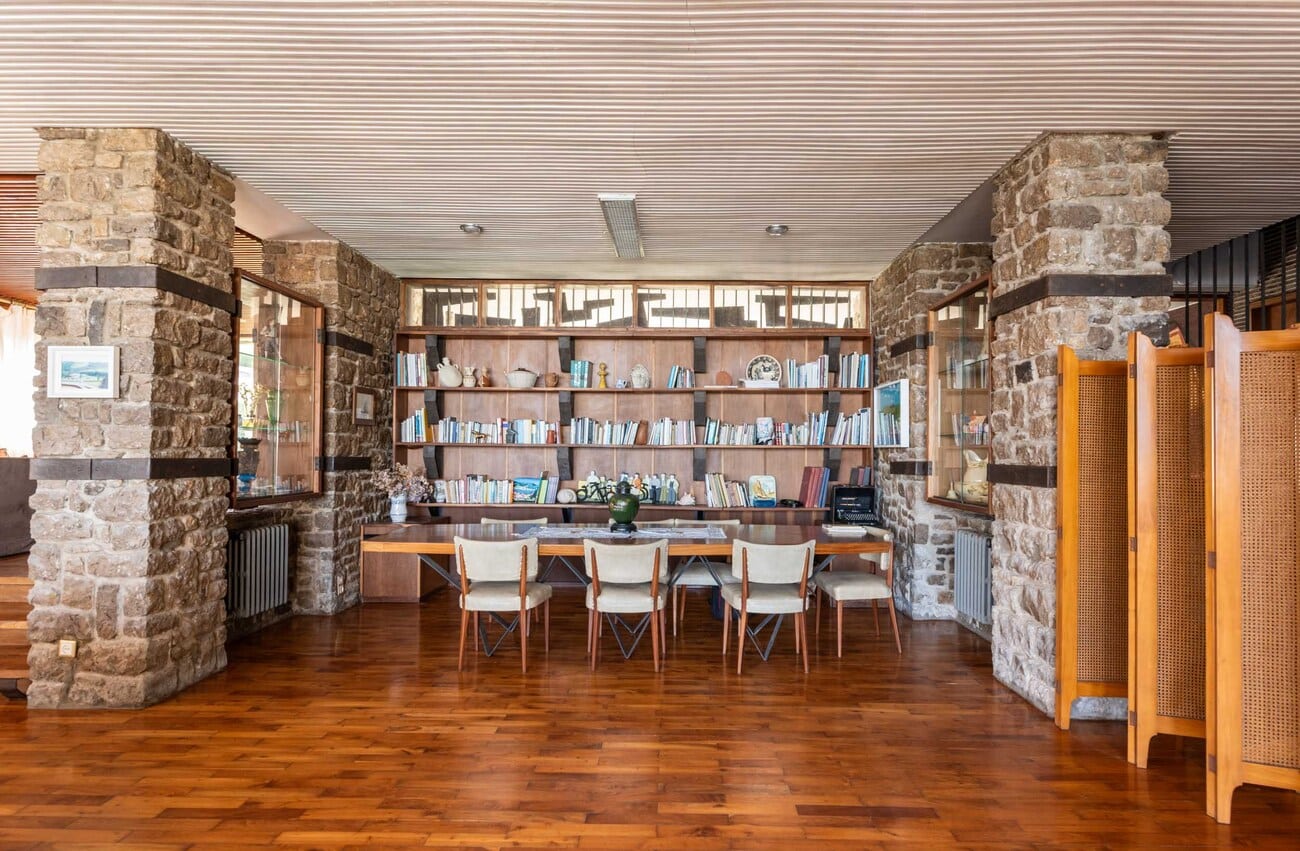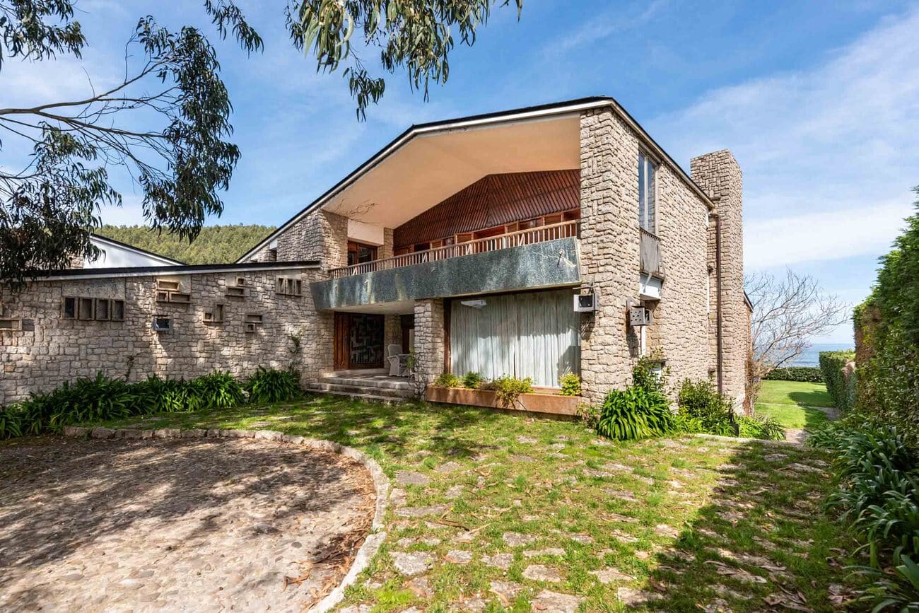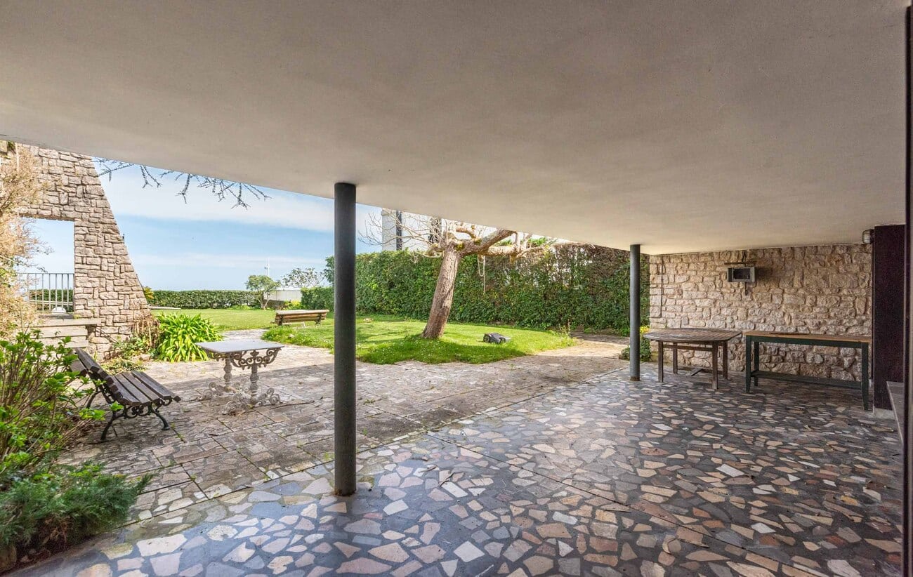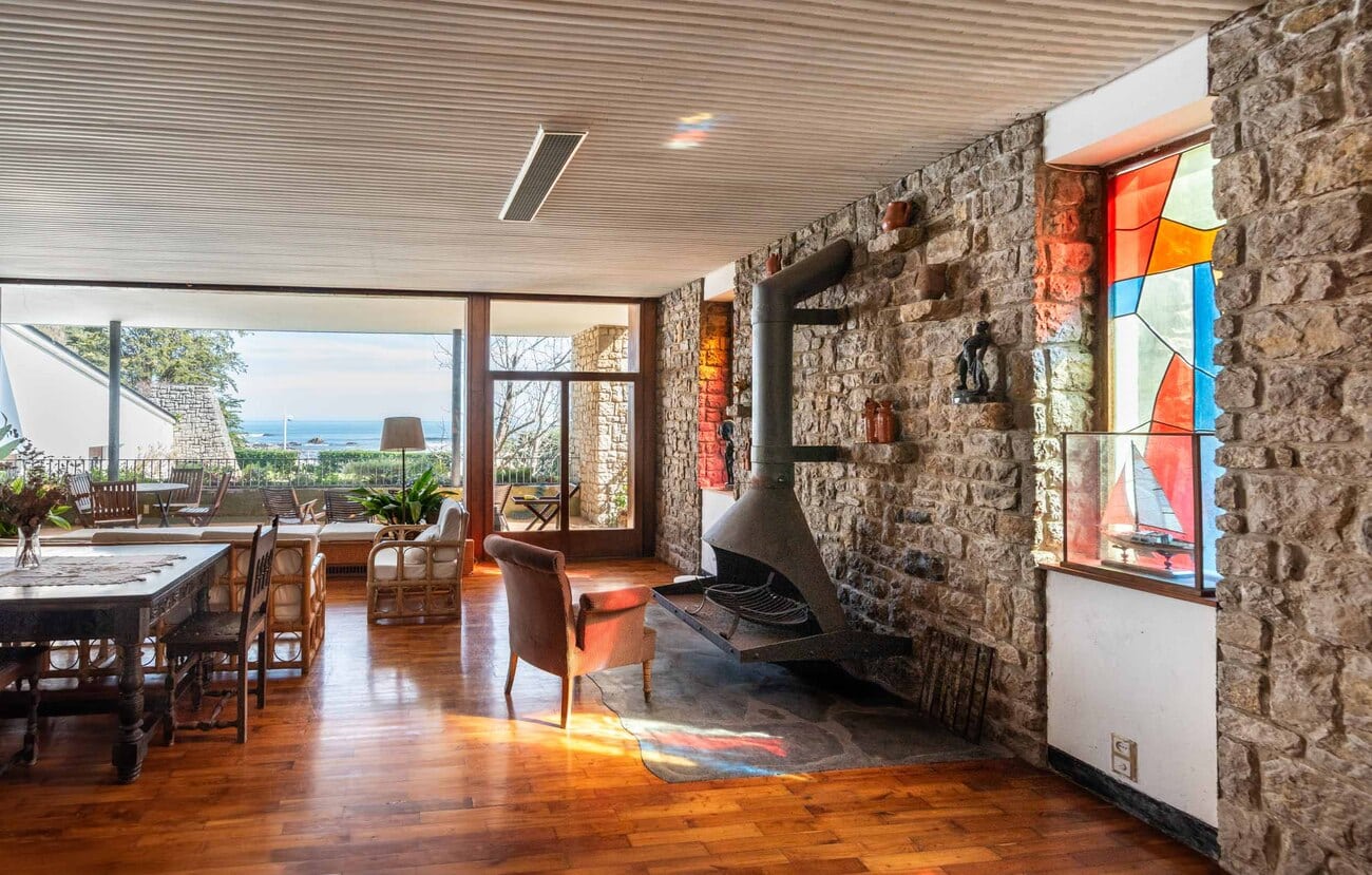 Construida sobre una de las parcelas más destacadas del frente marítimo, con cerca de 3.000 m² de terreno y una superficie construida aproximada de 920 m², la casa conserva intacta una identidad arquitectónica singular. Sus muros de piedra caliza de pequeño formato, combinados con paños revocados en distintos tonos y cubiertas de pizarra, componen una imagen sobria, expresiva y atemporal, enriquecida por la descomposición del volumen en distintas piezas y terrazas orientadas hacia el paisaje.