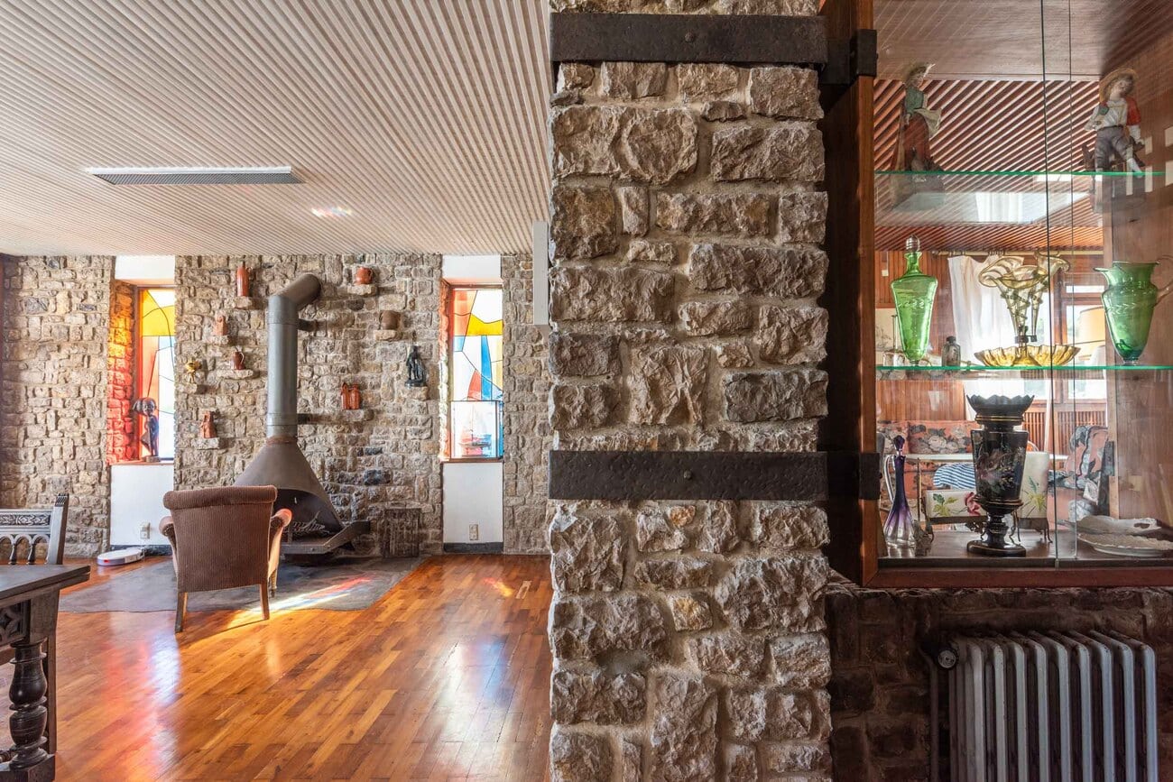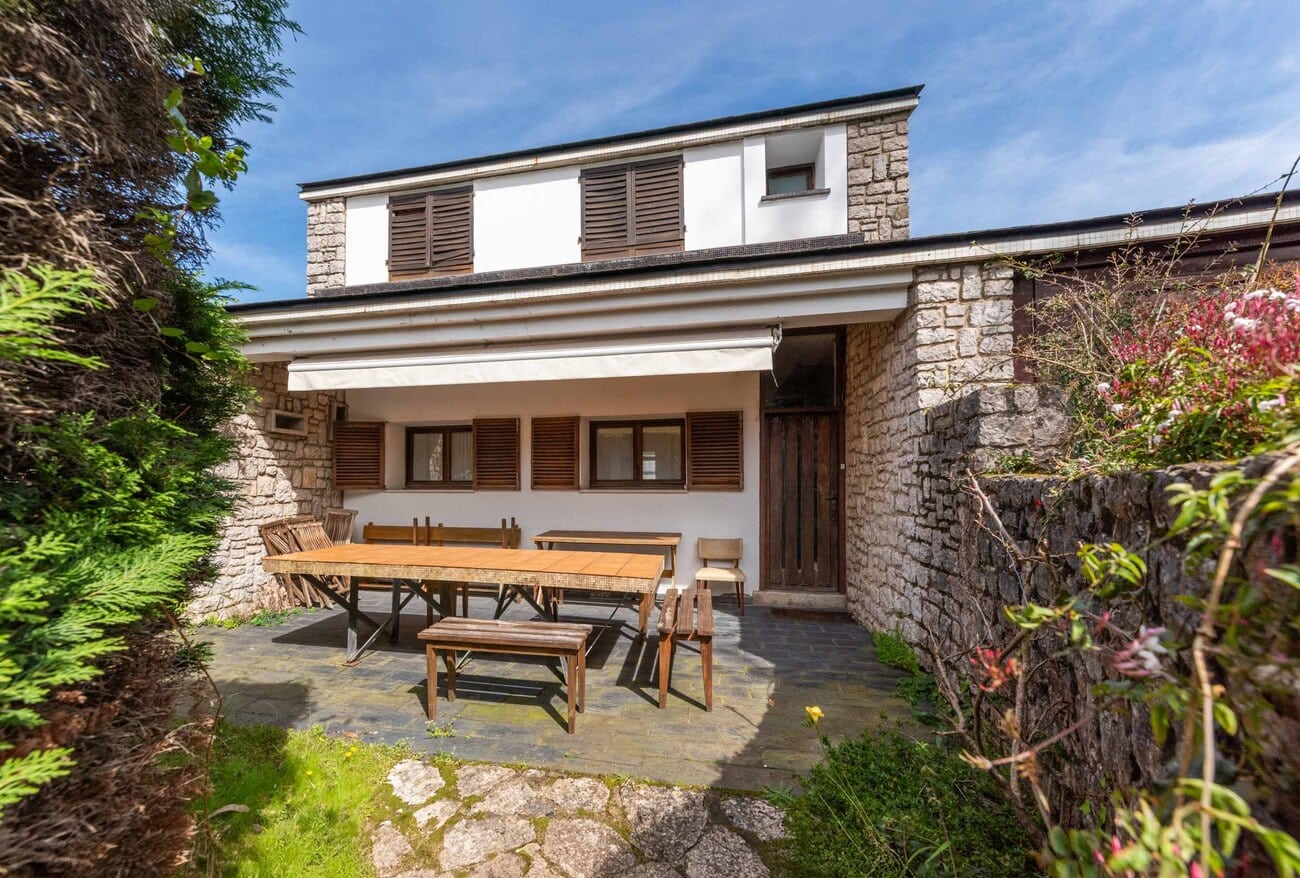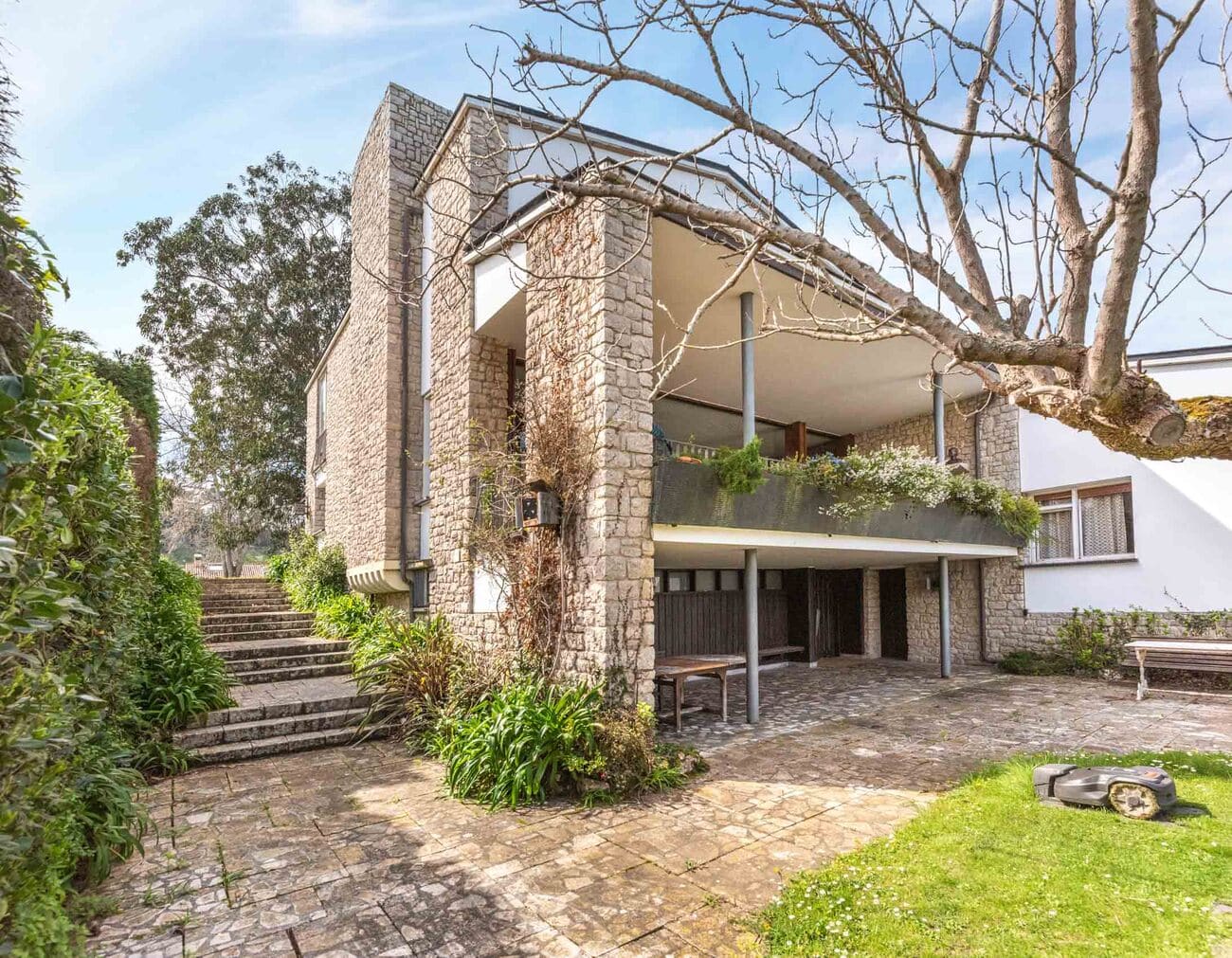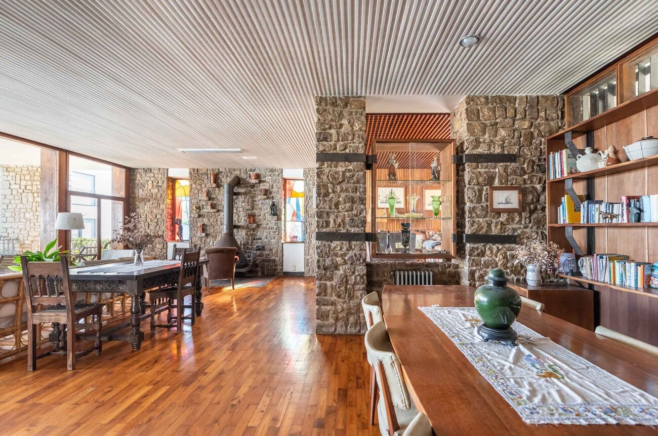 Construida sobre una de las parcelas más destacadas del frente marítimo, con cerca de 3.000 m² de terreno y una superficie construida aproximada de 920 m², la casa conserva intacta una identidad arquitectónica singular. Sus muros de piedra caliza de pequeño formato, combinados con paños revocados en distintos tonos y cubiertas de pizarra, componen una imagen sobria, expresiva y atemporal, enriquecida por la descomposición del volumen en distintas piezas y terrazas orientadas hacia el paisaje.
