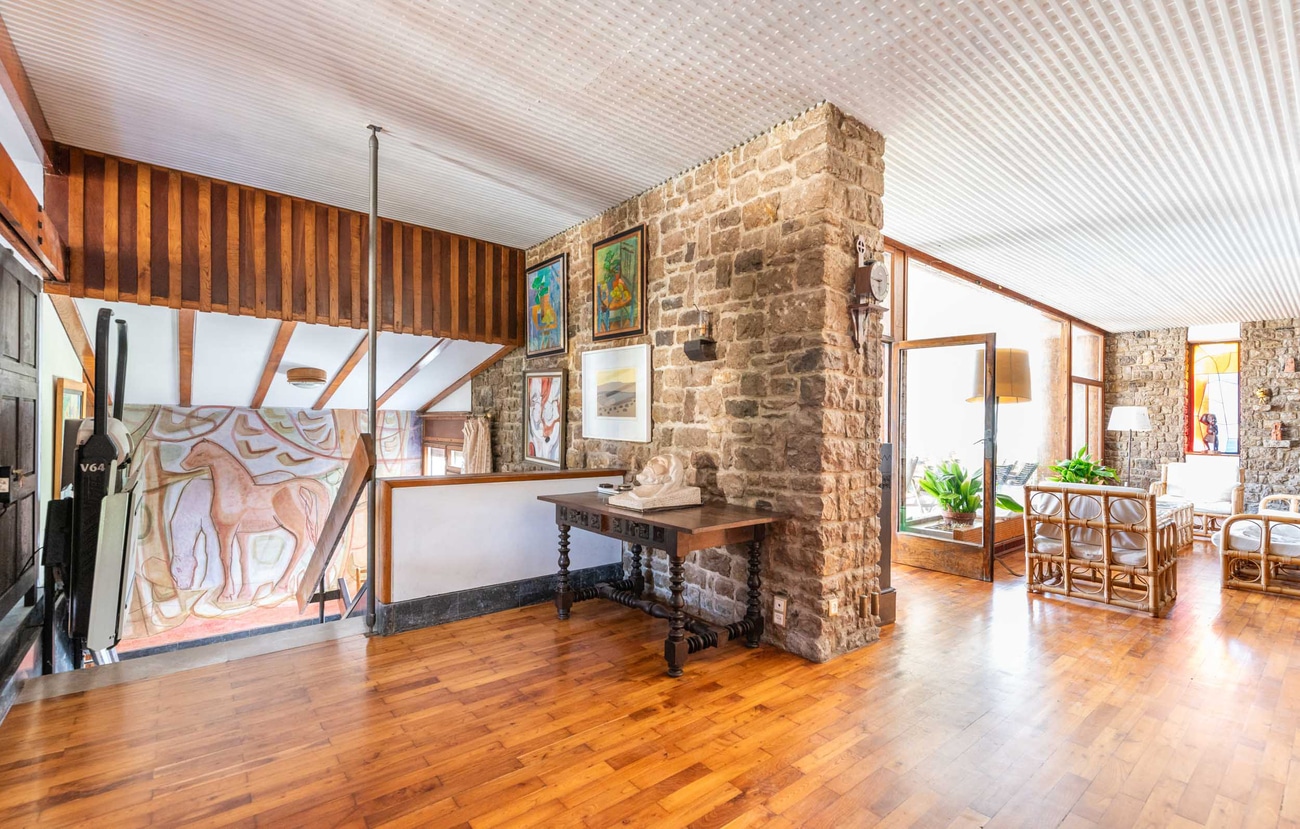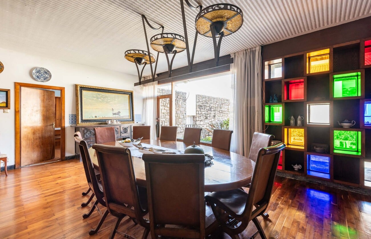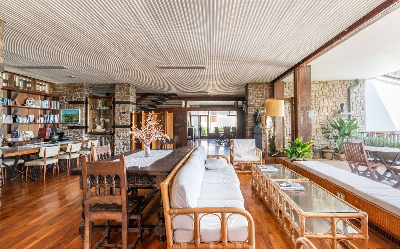 En la planta principal se concentran las grandes zonas de convivencia, con dos salones, dos comedores y varias áreas de estar y lectura que configuran un conjunto versátil, elegante y abierto tanto a la vida cotidiana como a la recepción de invitados. Estas estancias mantienen una relación directa con el jardín y con las terrazas, además de disfrutar de vistas al mar, reforzando la conexión entre interior y exterior que define la vivienda. La riqueza del interior se ve acentuada por la presencia de elementos artísticos y decorativos integrados en la propia arquitectura, entre ellos mosaicos, pinturas murales, vidrieras, carpinterías y trabajos de forja diseñados específicamente para la casa, varios de ellos realizados por Antonio Suárez.