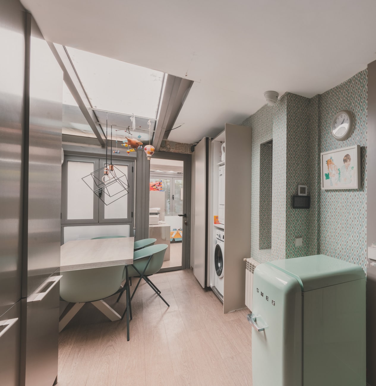 La zona de cocina ha sido objeto de una ampliación de 30 m² hacia el jardín, incorporando un espacio adicional actualmente destinado a zona de juegos.