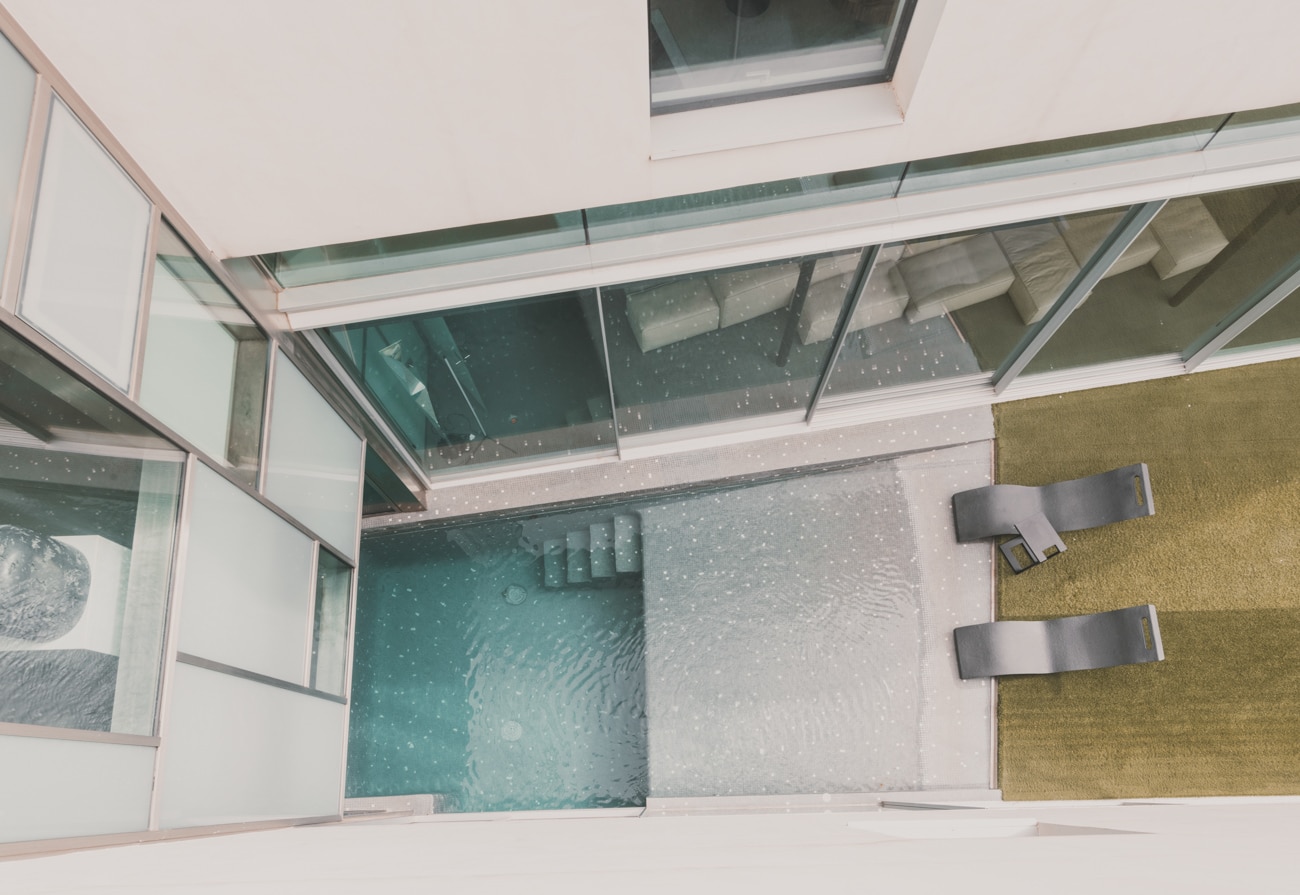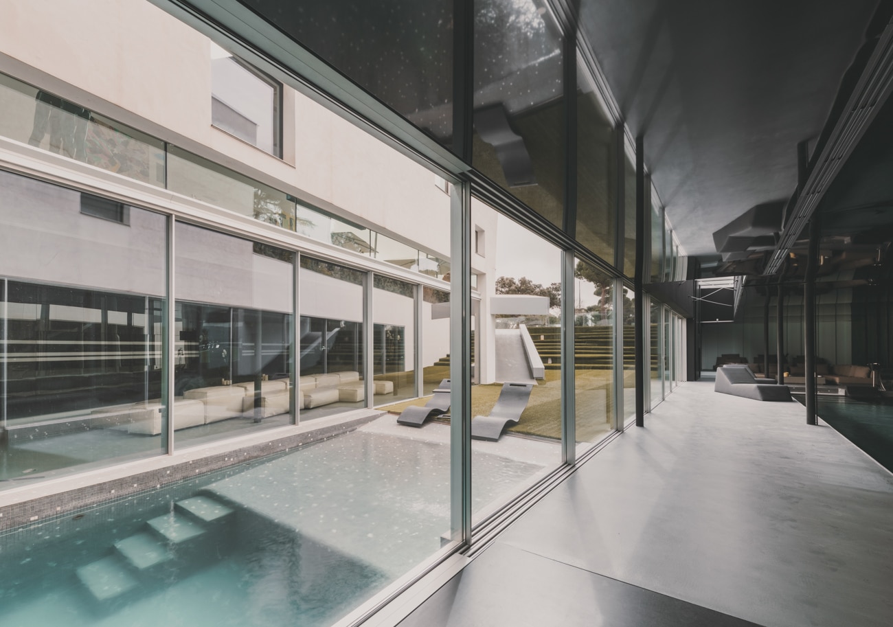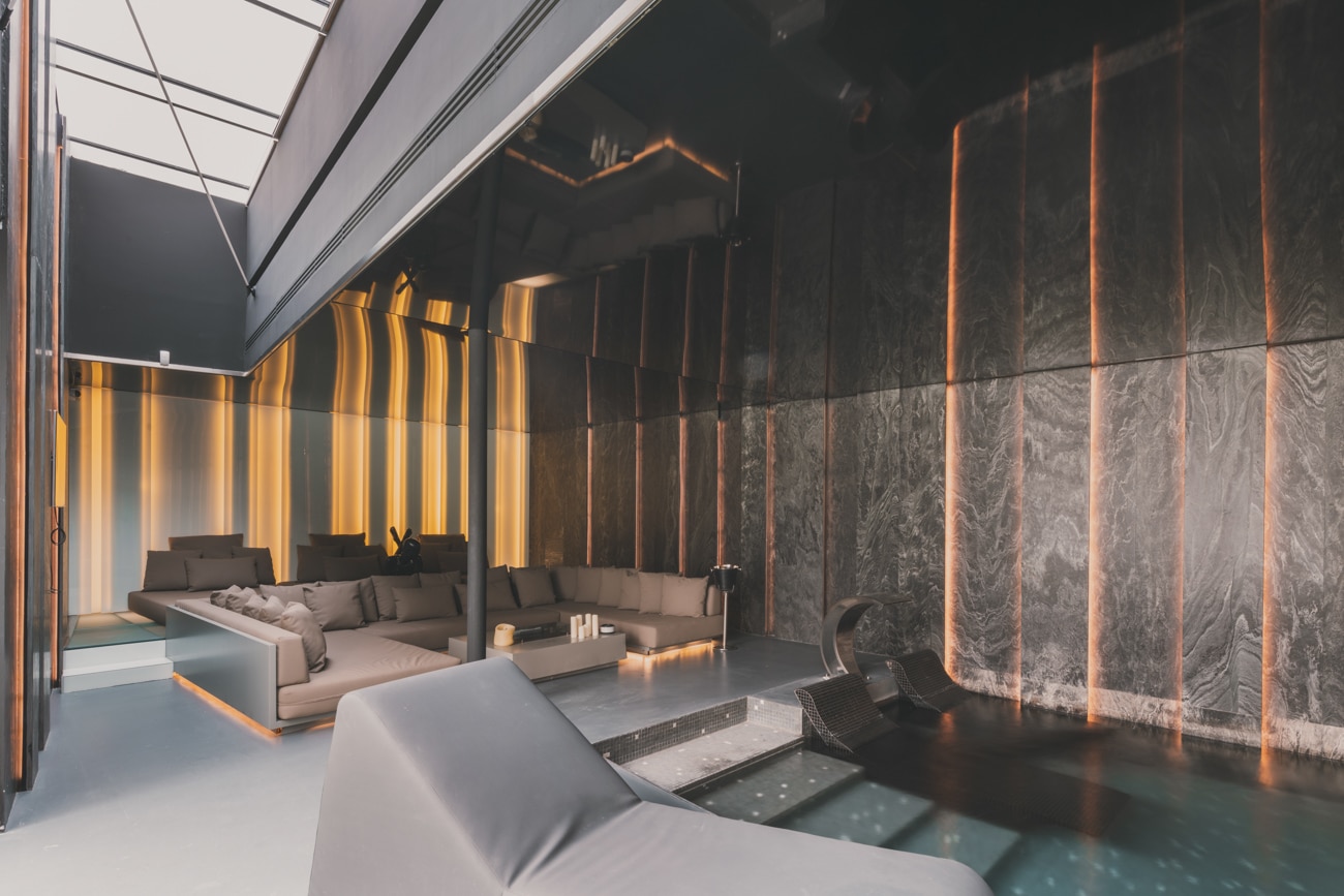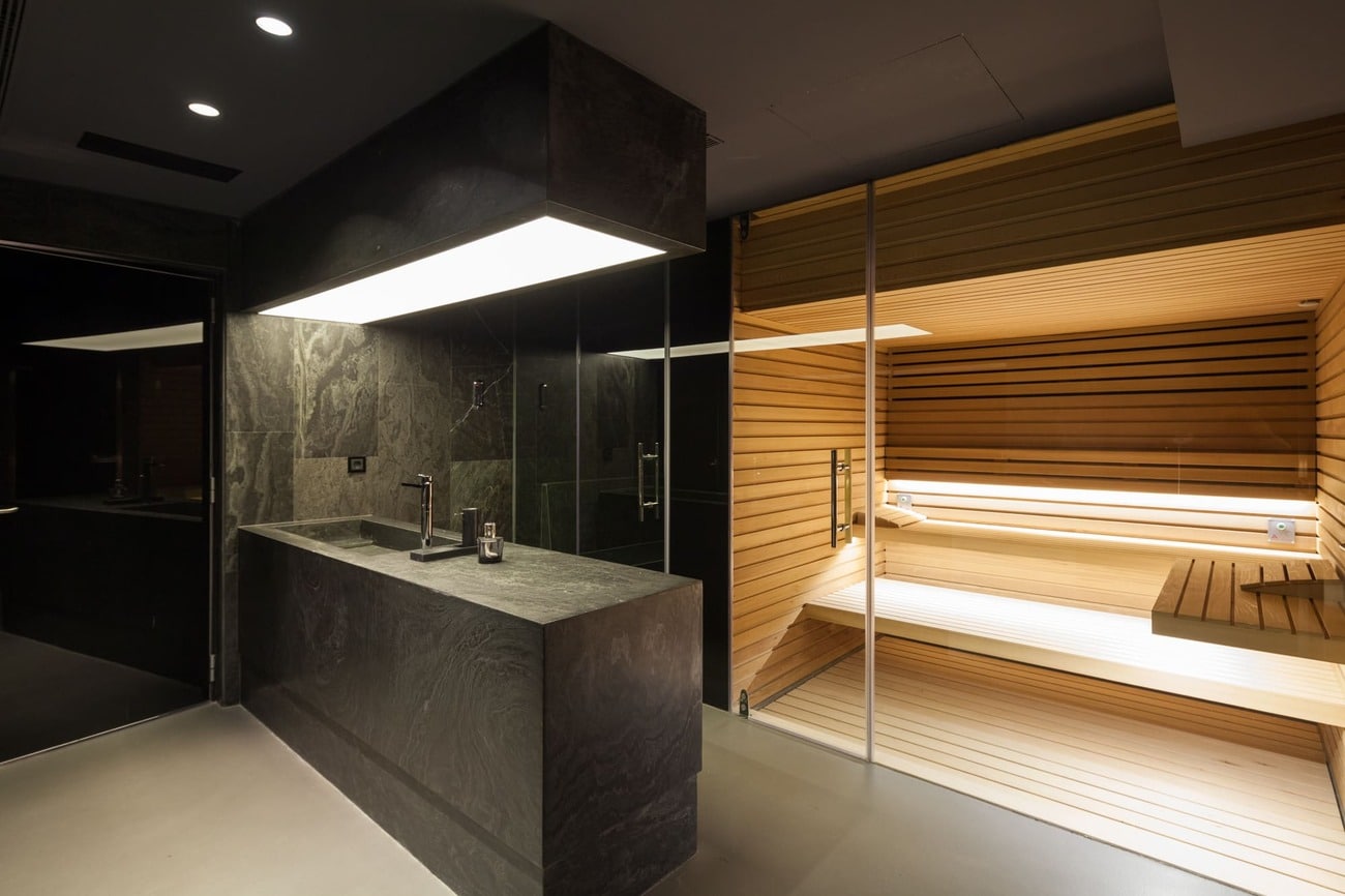 En la planta sótano, bañada de luz natural, el agua adquiere un papel protagonista con una piscina interior climatizada de 23 metros, acompañada de una zona de relax con chimenea y camas chill out, sauna, baño turco, duchas con cromoterapia, gimnasio y espacios dedicados al bienestar.