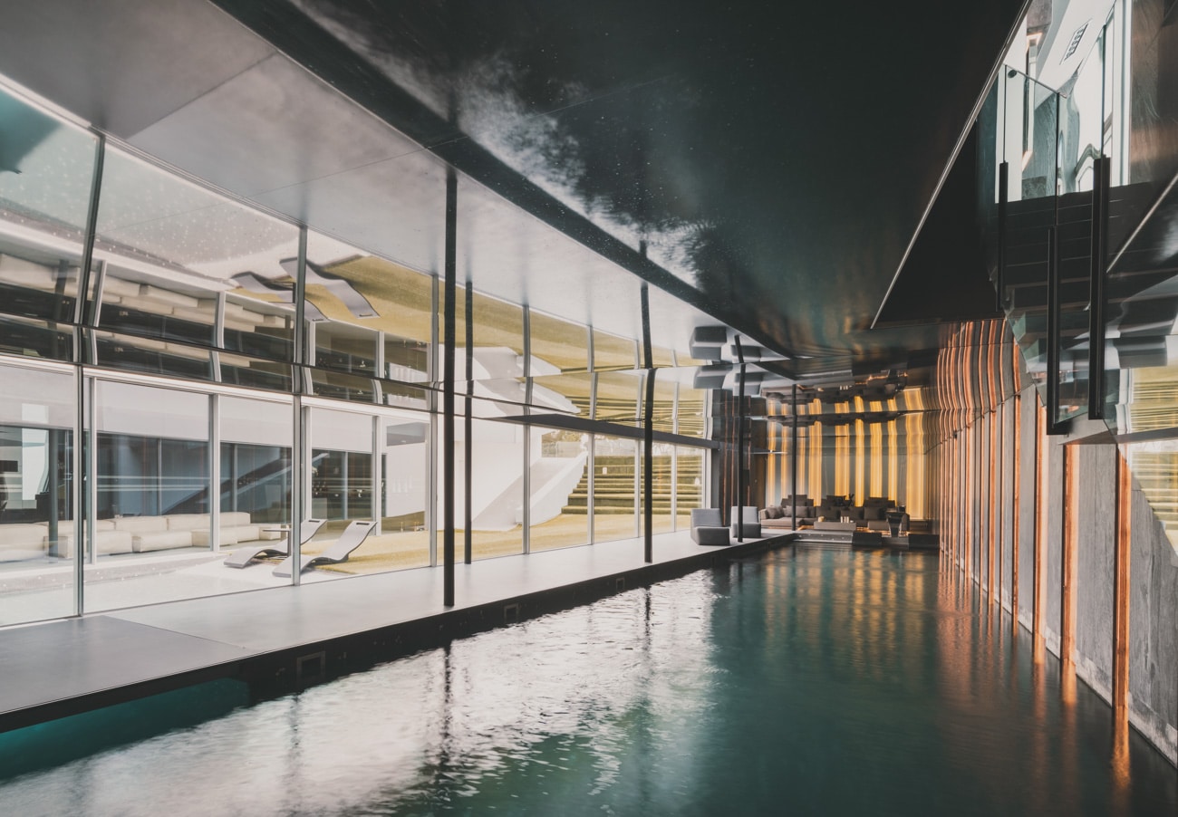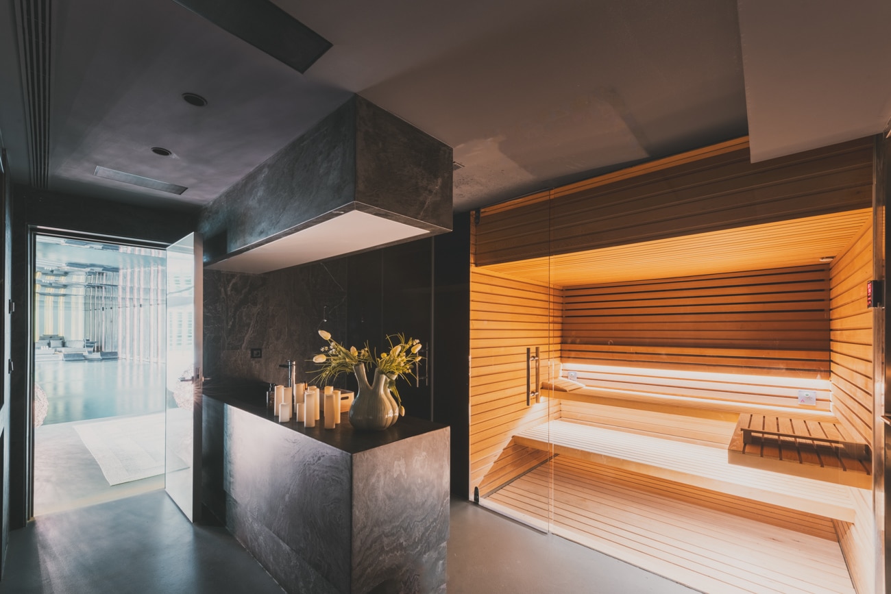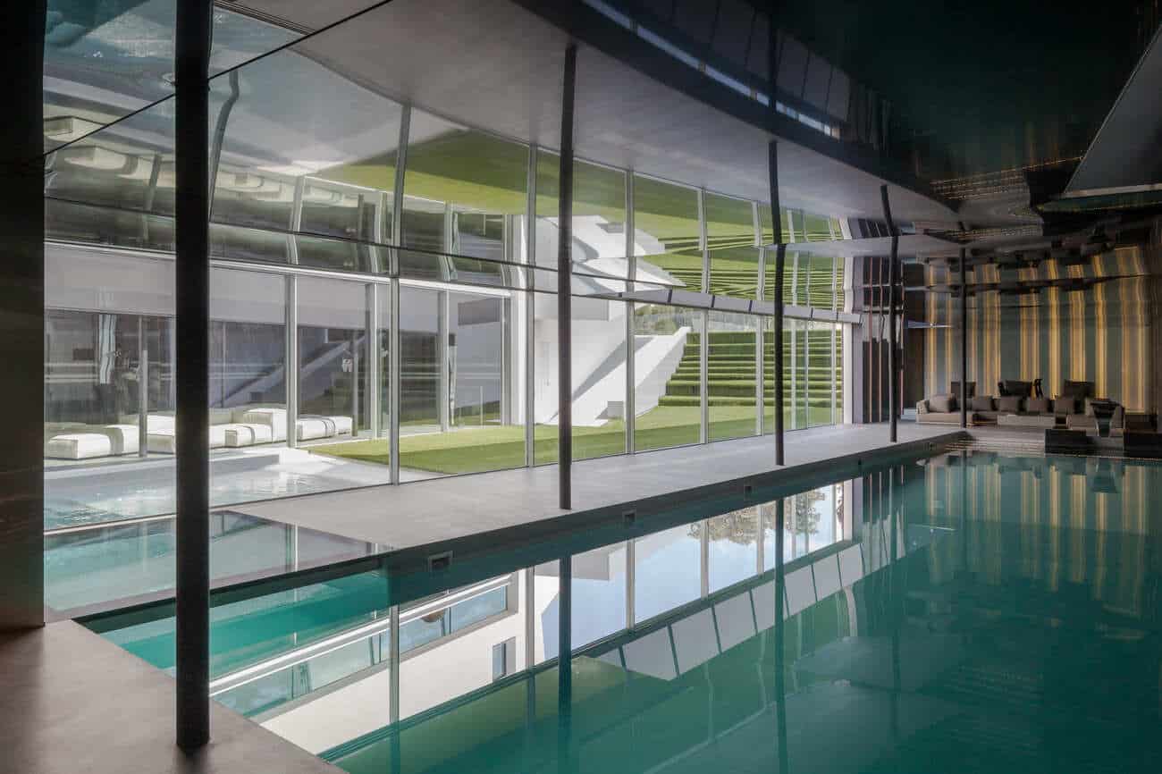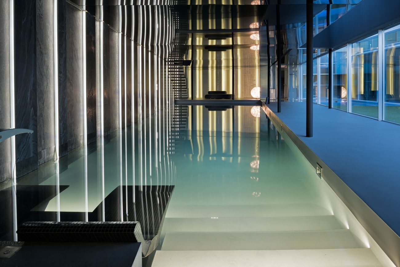 En la planta sótano, bañada de luz natural, el agua adquiere un papel protagonista con una piscina interior climatizada de 23 metros, acompañada de una zona de relax con chimenea y camas chill out, sauna, baño turco, duchas con cromoterapia, gimnasio y espacios dedicados al bienestar.