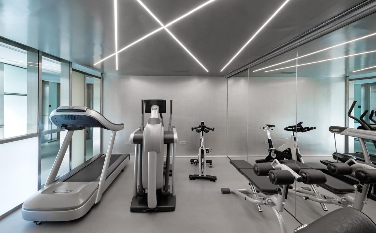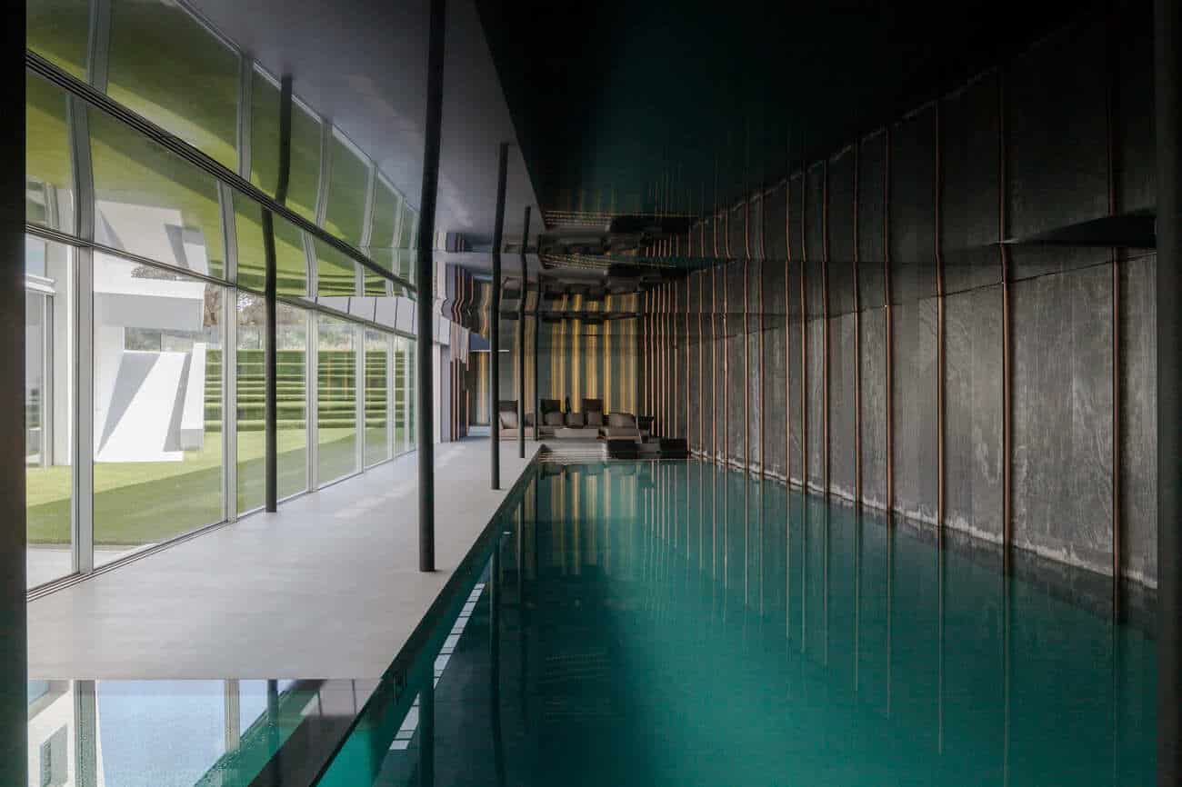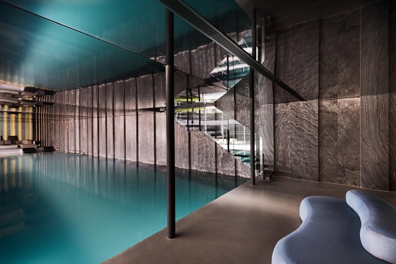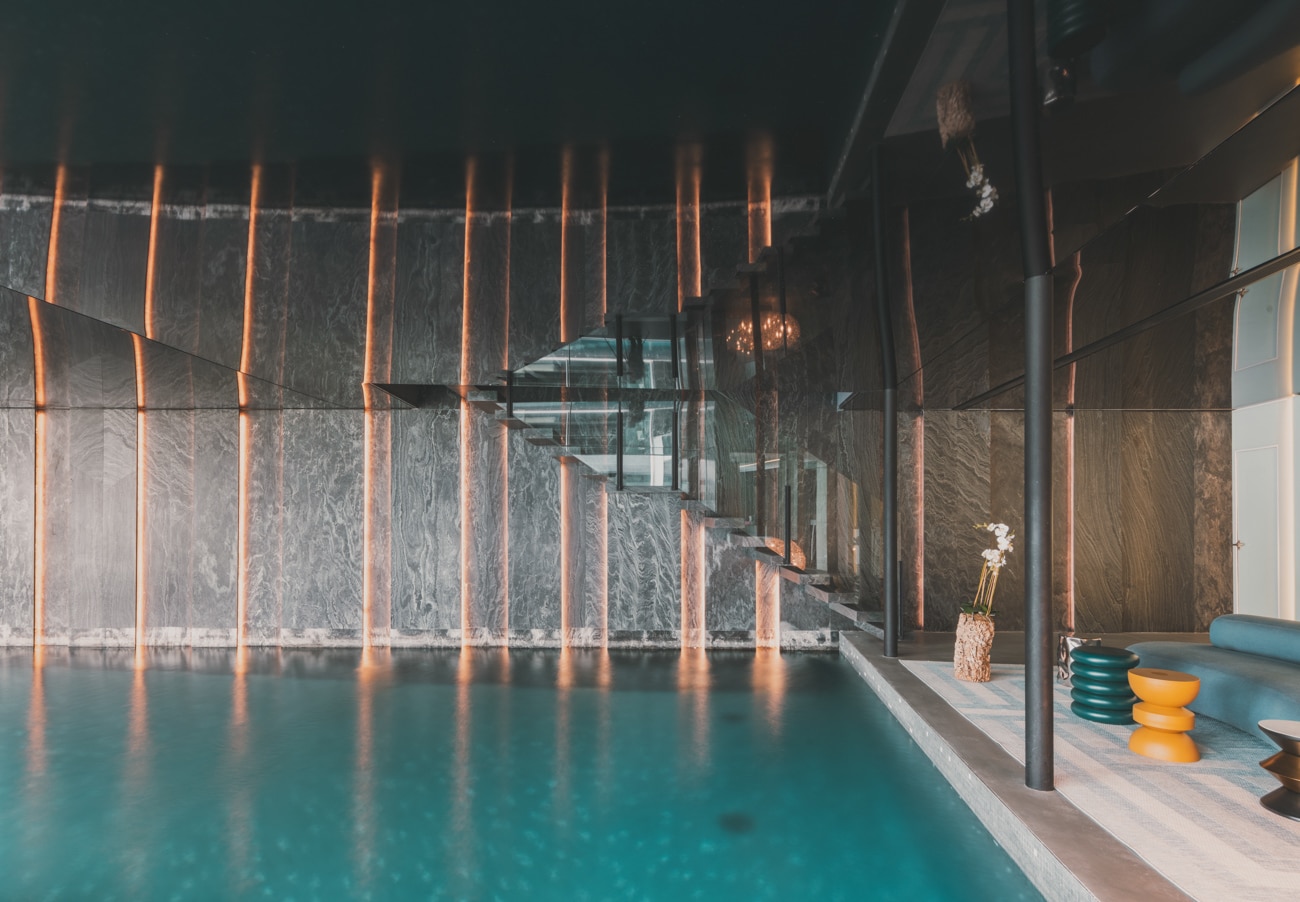 En la planta sótano, bañada de luz natural, el agua adquiere un papel protagonista con una piscina interior climatizada de 23 metros, acompañada de una zona de relax con chimenea y camas chill out, sauna, baño turco, duchas con cromoterapia, gimnasio y espacios dedicados al bienestar.