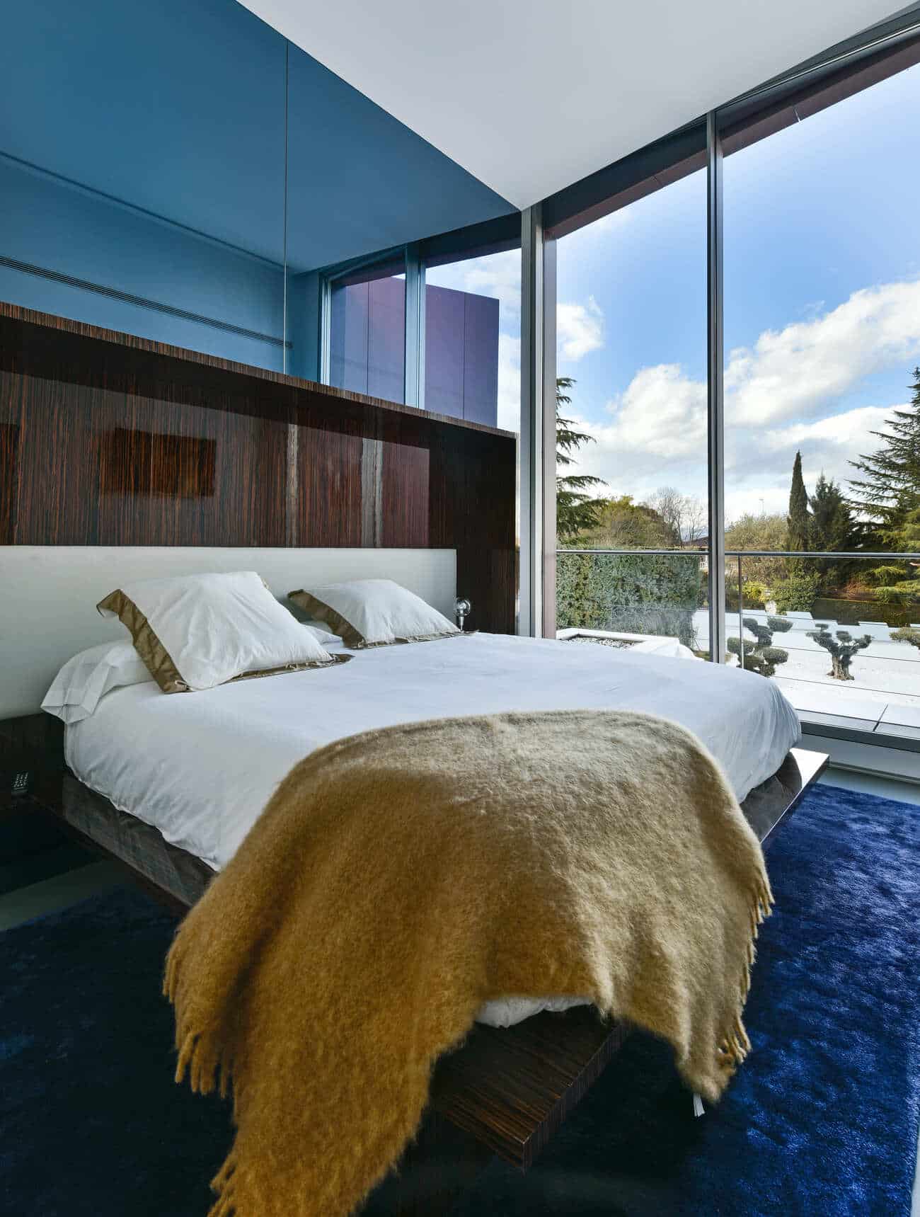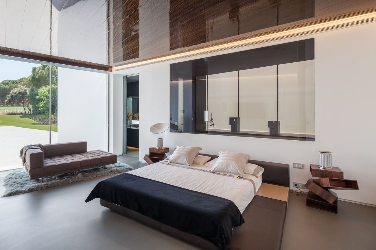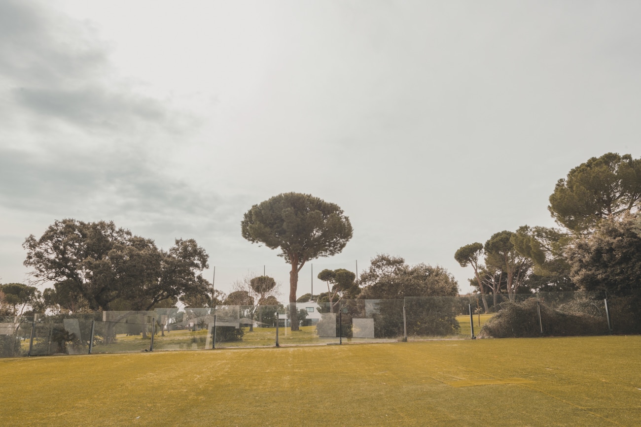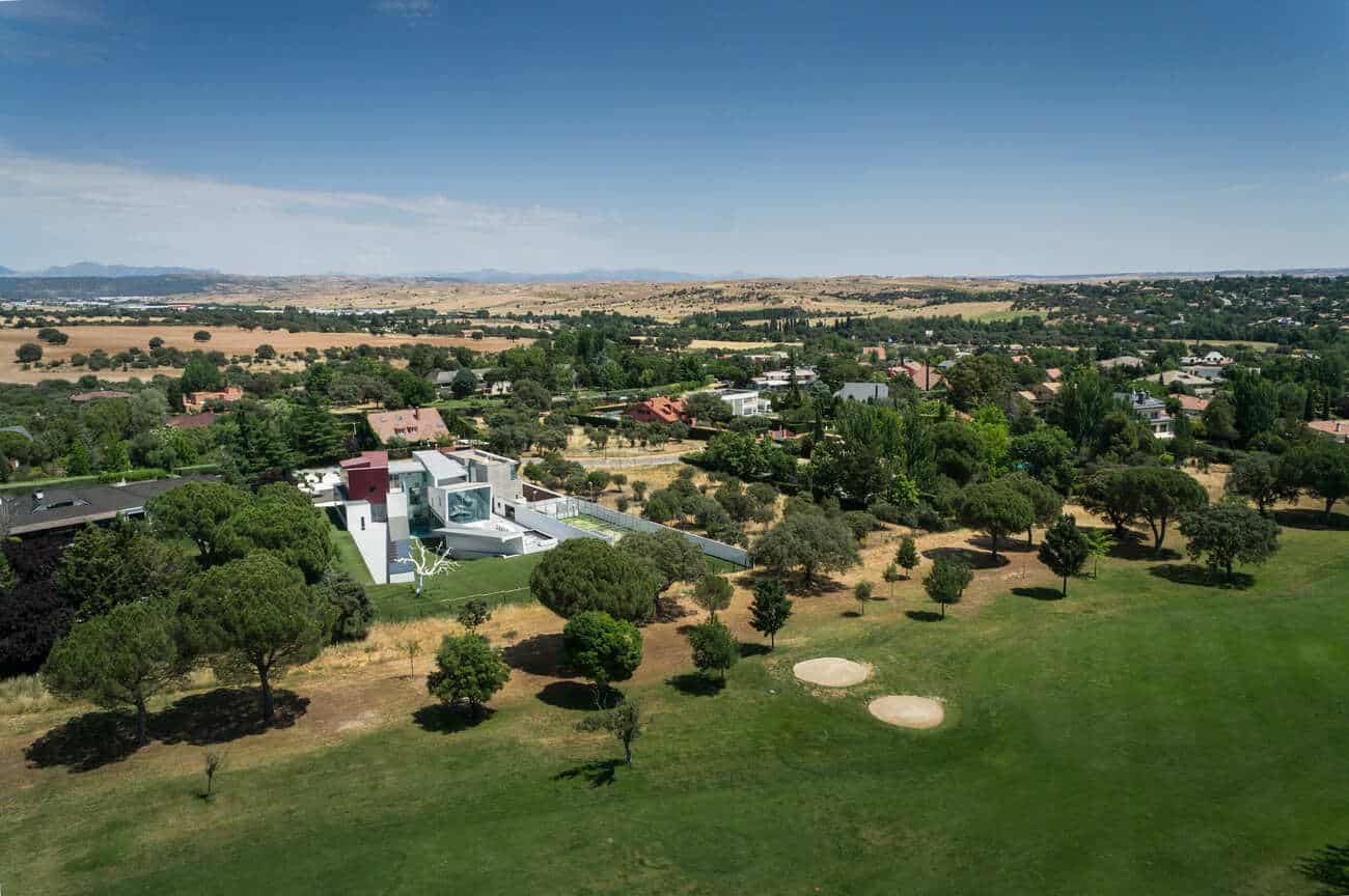 El exterior se funde con el entorno natural y el campo de golf, incorporando el paisaje al interior a través de grandes muros de cristal y diluyendo los límites entre dentro y fuera.