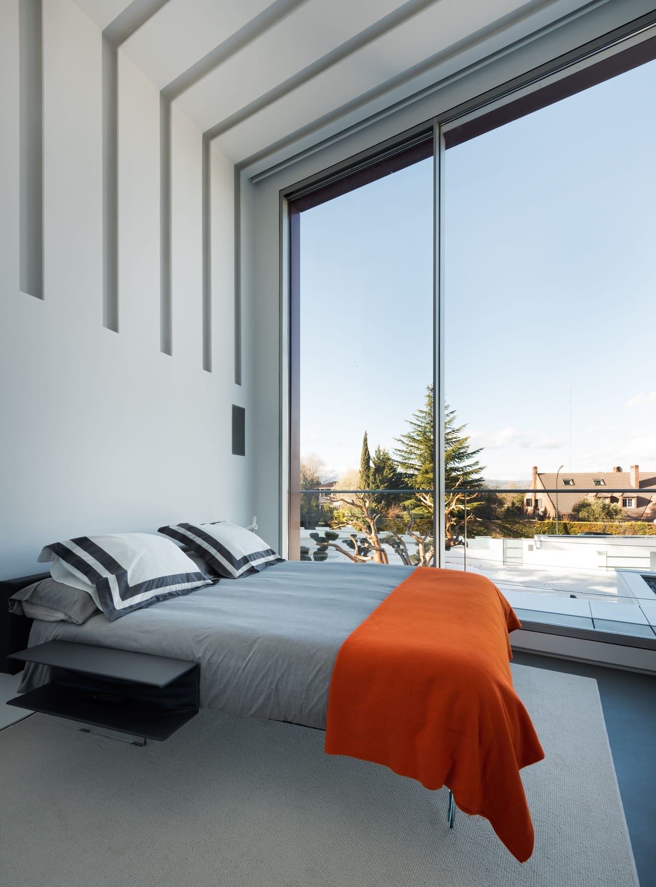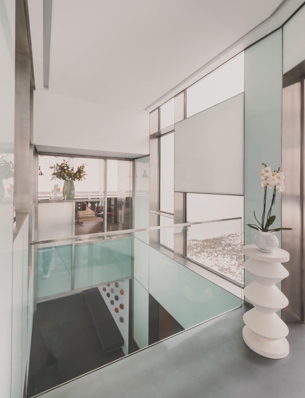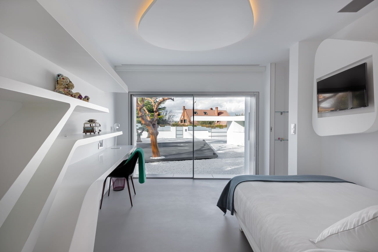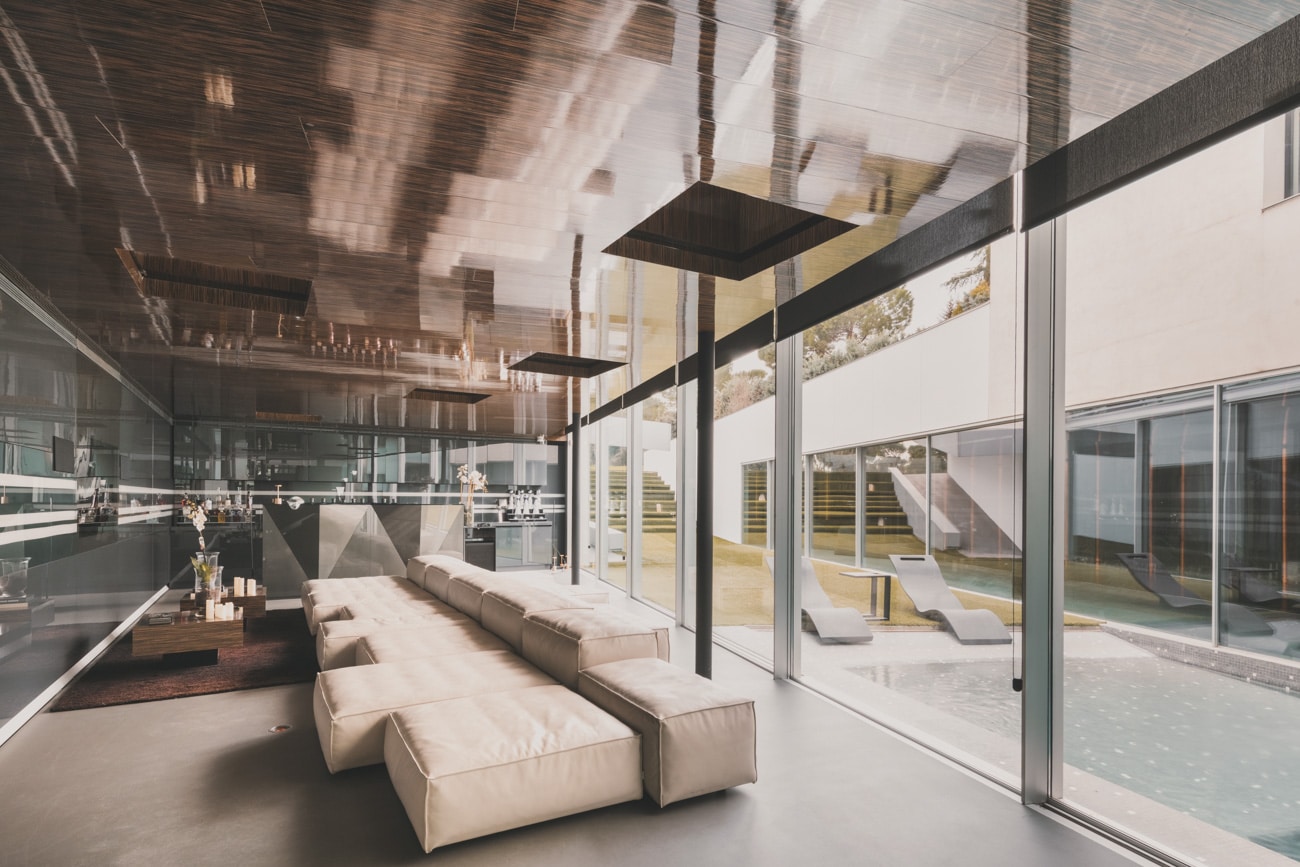 El acceso se produce a través de un patio de entrada concebido como transición entre el exterior y el universo íntimo de la vivienda, acompañado por el sonido del agua que anticipa una atmósfera de calma. Desde allí se accede a una gran estancia continua a doble altura, de acero y cristal, que oculta y revela los espacios de forma progresiva, casi museística.