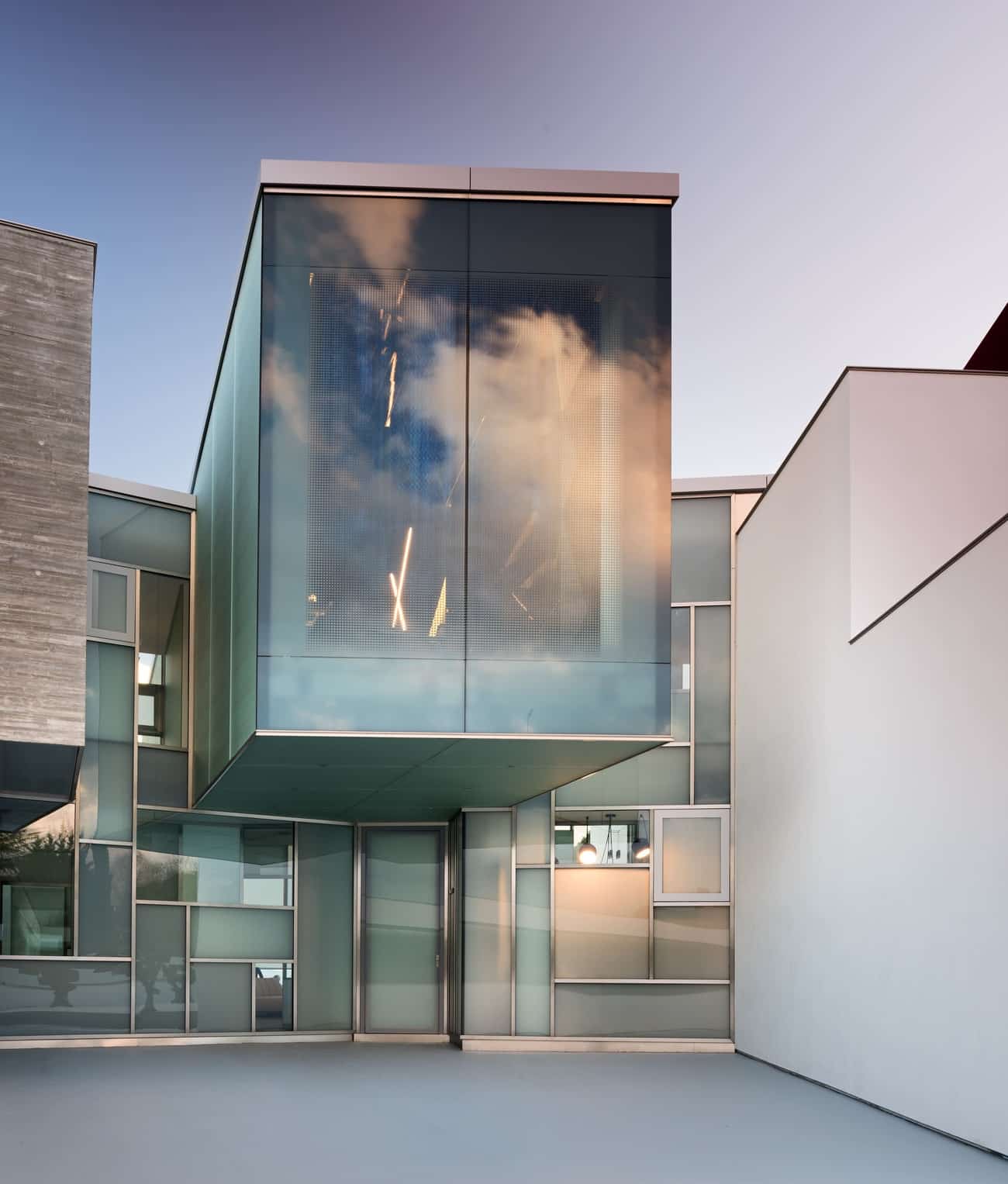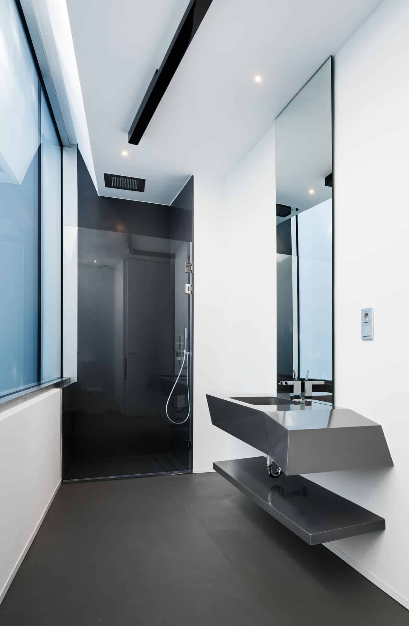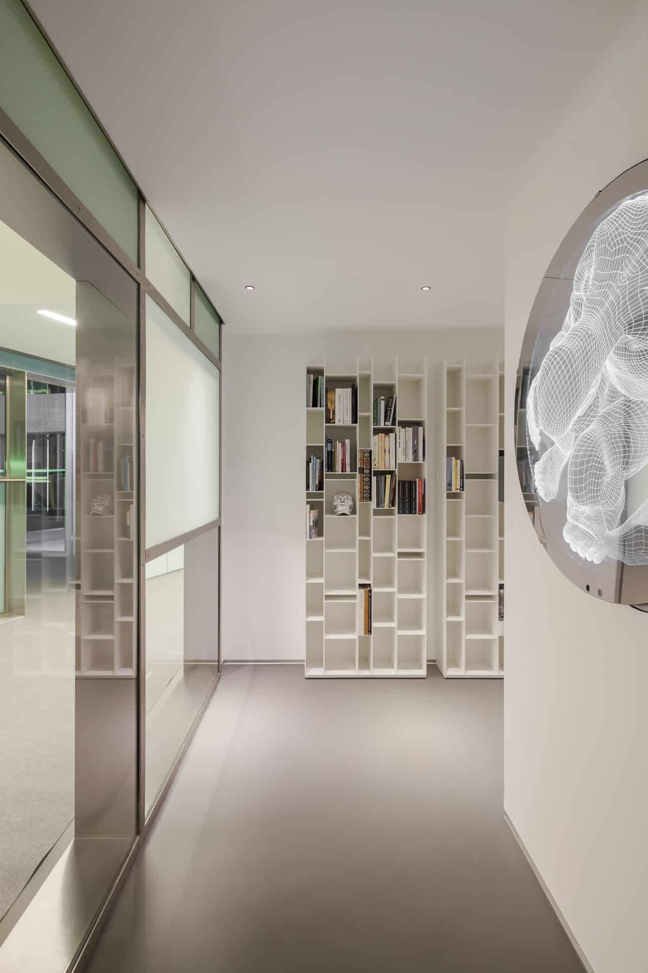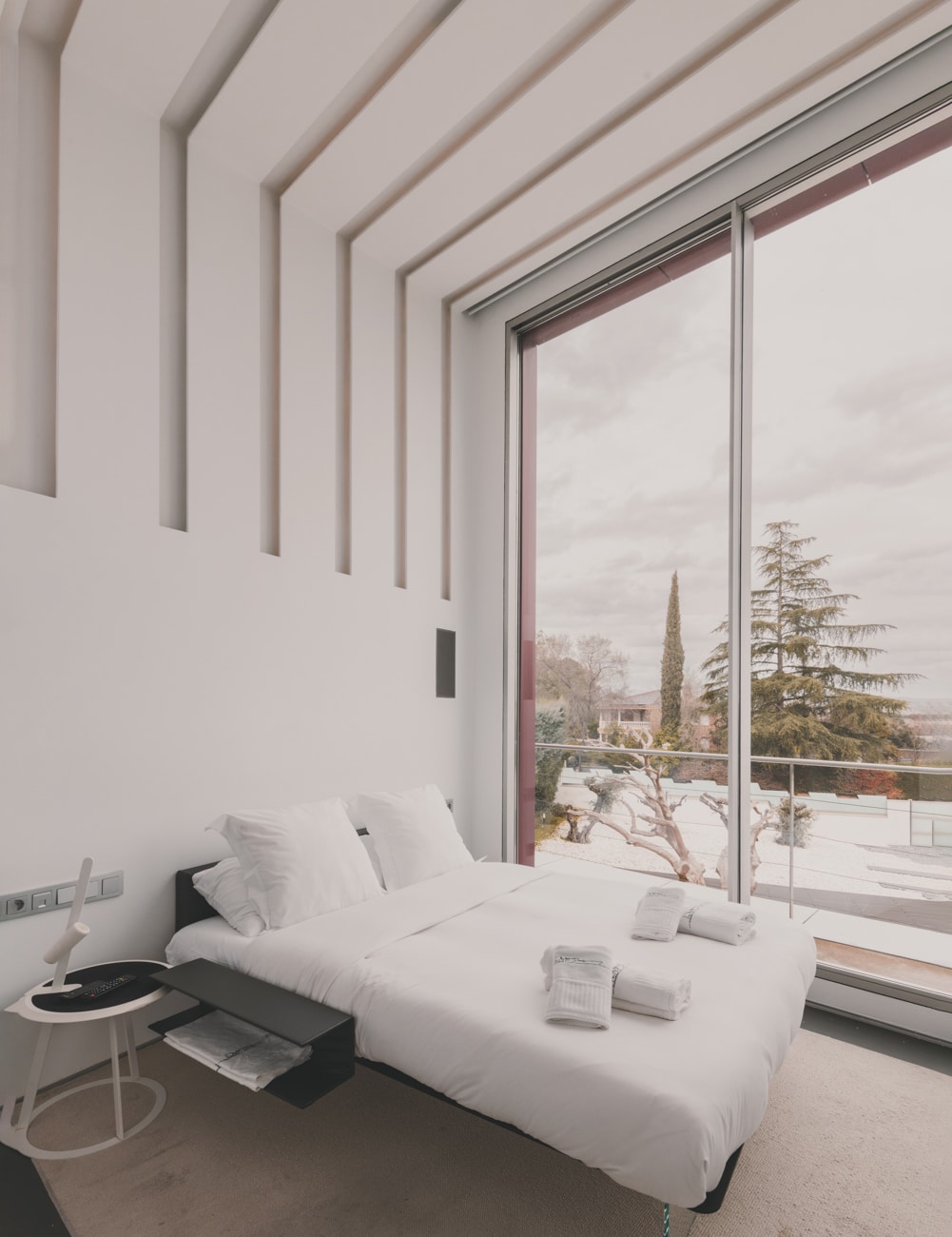 El acceso se produce a través de un patio de entrada concebido como transición entre el exterior y el universo íntimo de la vivienda, acompañado por el sonido del agua que anticipa una atmósfera de calma. Desde allí se accede a una gran estancia continua a doble altura, de acero y cristal, que oculta y revela los espacios de forma progresiva, casi museística.