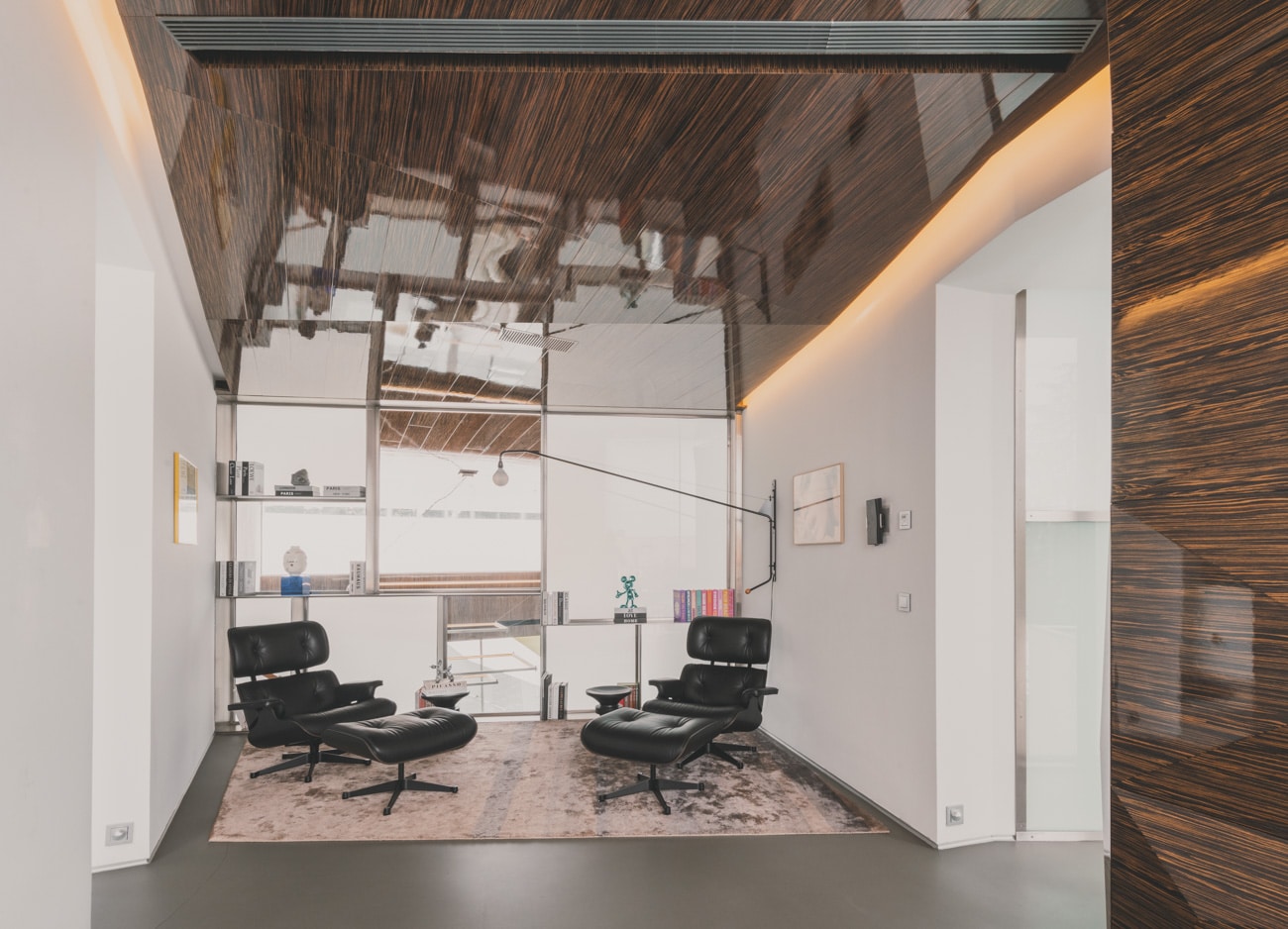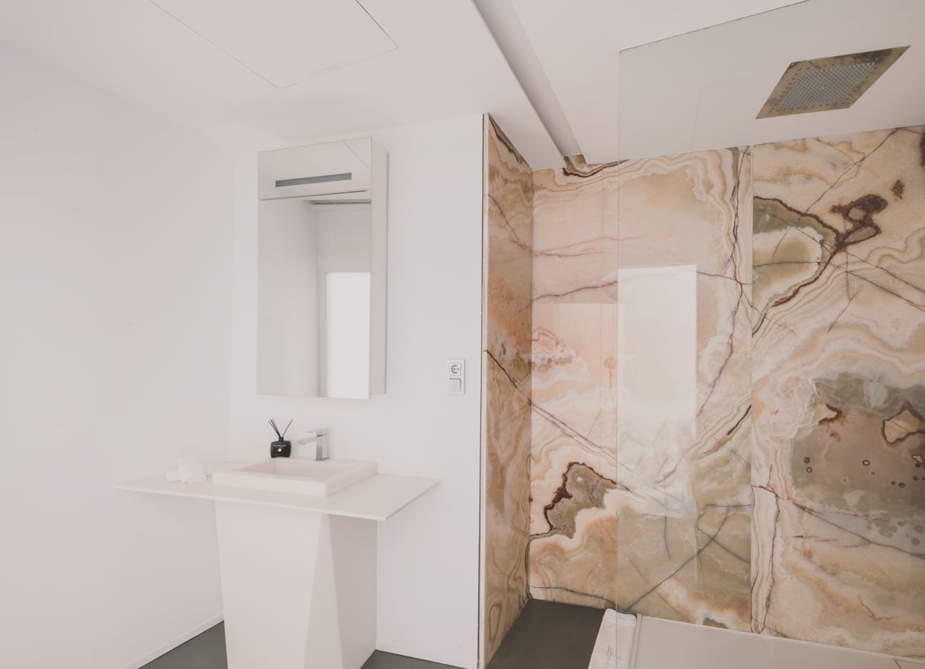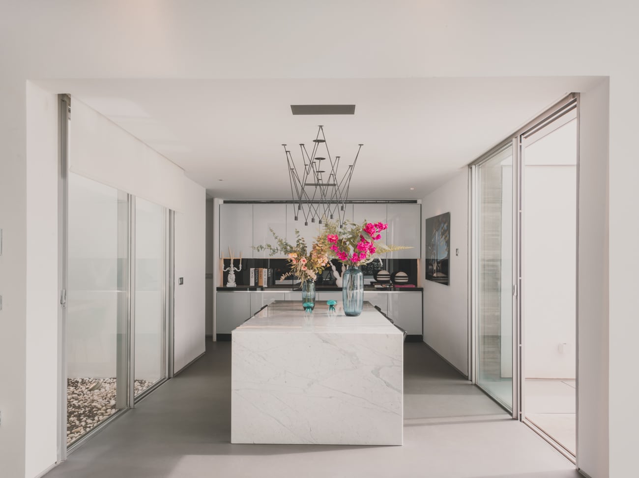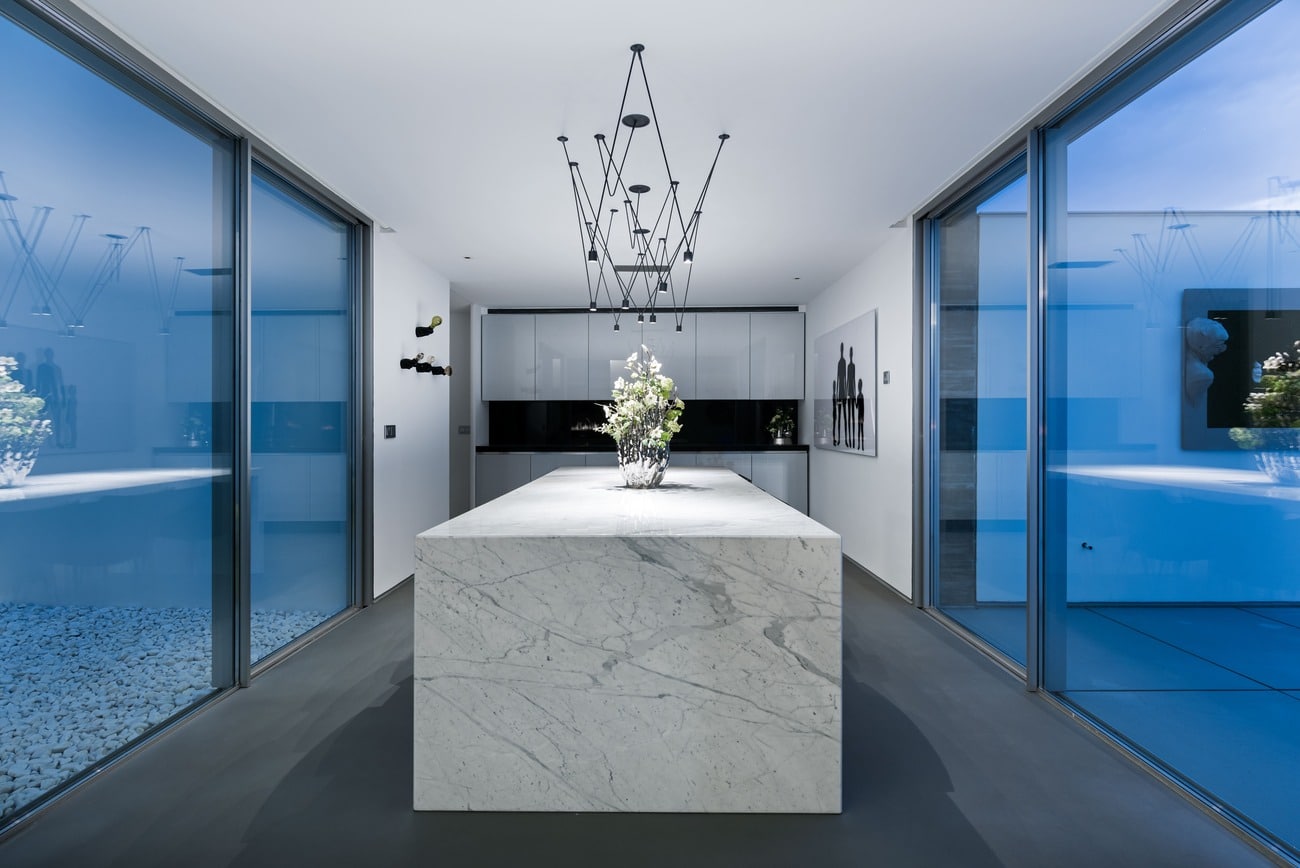 En el interior, piedra natural, metales, vidrios de distintas opacidades y maderas nobles como el ébano construyen espacios serenos, sofisticados y atemporales, donde cada estancia posee identidad propia sin perder la coherencia global.