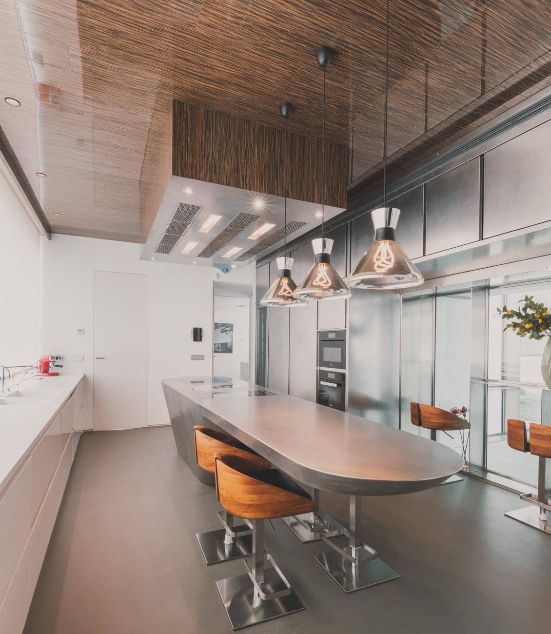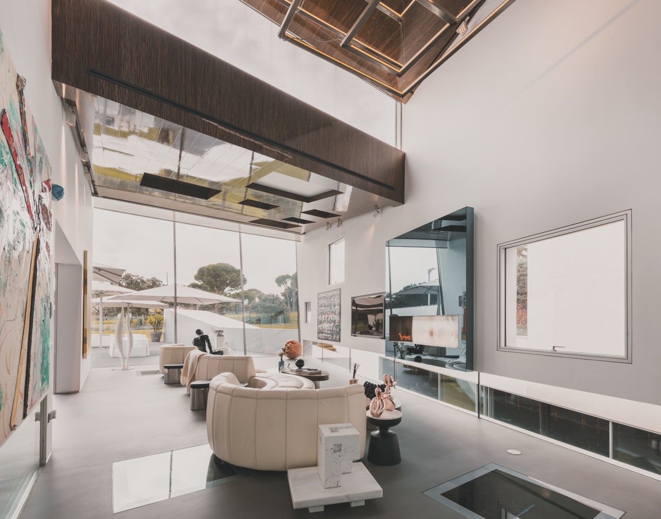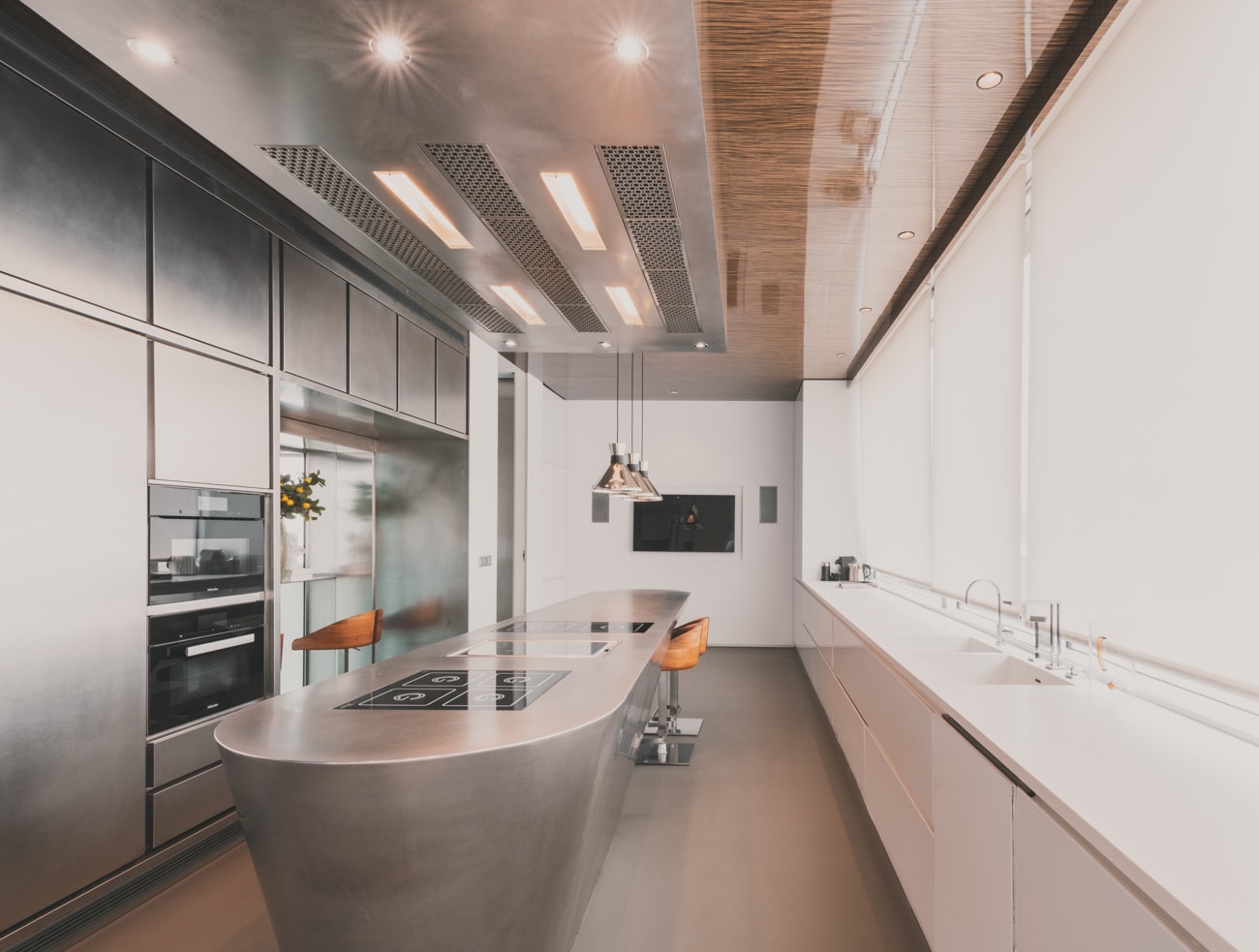 El salón–museo, con más de siete metros de altura y abundante luz natural, se convierte en el corazón de la casa, un espacio donde arte, arquitectura y vida cotidiana conviven en equilibrio. La cocina, diseñada en exclusiva por Ferran Adrià, se plantea como una pieza escultórica integrada en la arquitectura; una estructura de acero donde cocinar se transforma en una experiencia creativa, social y sensorial.